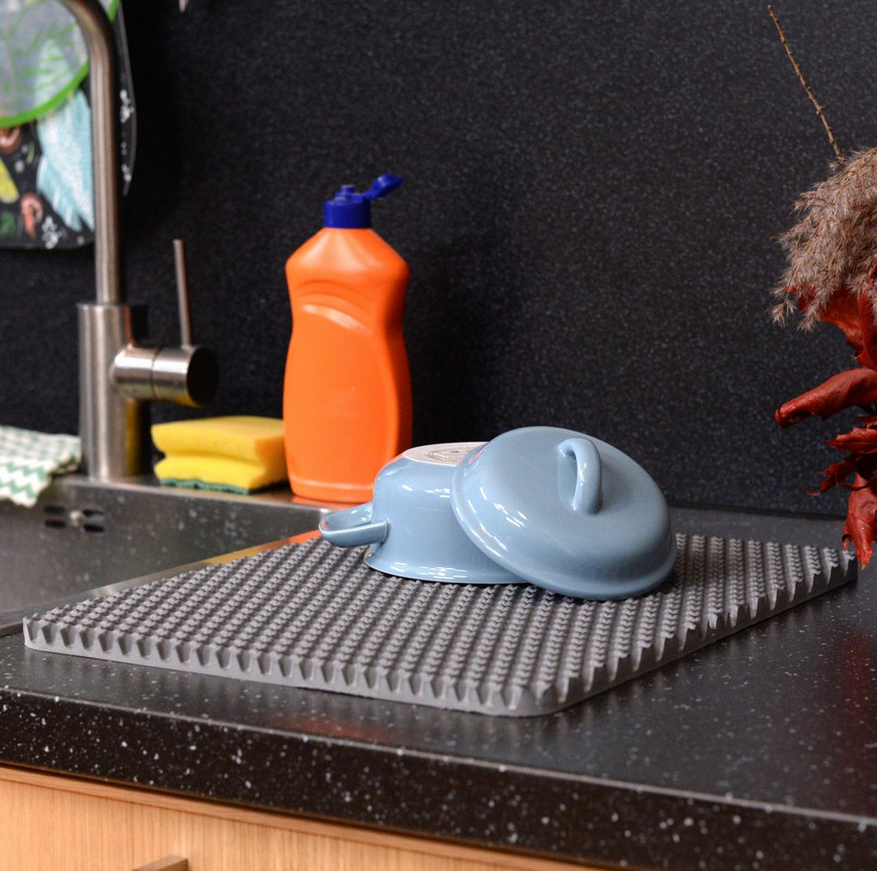 Коврик предназначен для сушки посуды, столовых приборов, бокалов. Также его можно использовать для сушки овощей, фруктов, зелени, для разморозки продуктов. Коврик с ячеистой поверхностью хорошо захватывает стекающую воду, при этом обратная сторона коврика остается сухой. С него нужно только вытряхнуть воду, остатки влаги просто испарятся. Перед первым применением и после каждого использования помойте, можно с жидким моющим средством, сполосните и просушите.