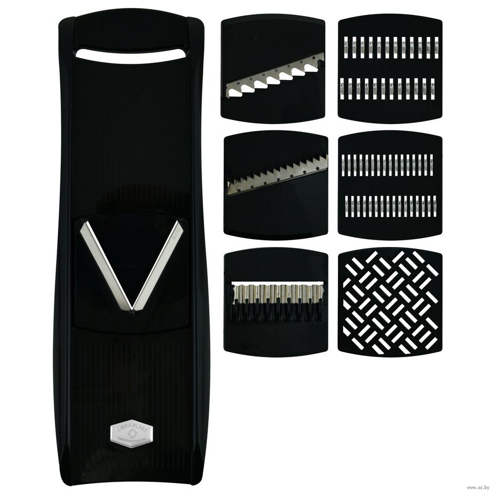 Изготовлено: лезвия из коррозионностойкой (нержавеющей) стали, корпуса тёрки и насадок из пластмассы (АBS).Размер тёрки с корпусом 37х12х4 см, размер насадок 8х6,5х0,7 см.
