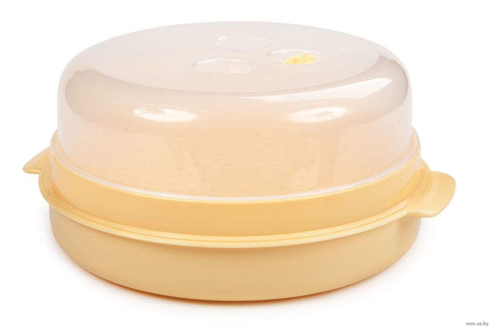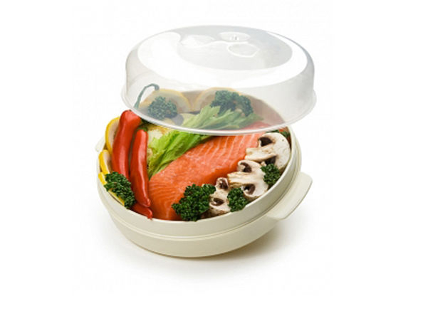 Пароварка для СВЧ поможет приготовить вкусную и полезную еду. Состоит из поддона, сита и крышки, на которой размещен клапан, помогающий по своему усмотрению регулировать пар. Изготовлена из качественного и прочного пластика. Легко моется. Проста и удобна в пользовании.