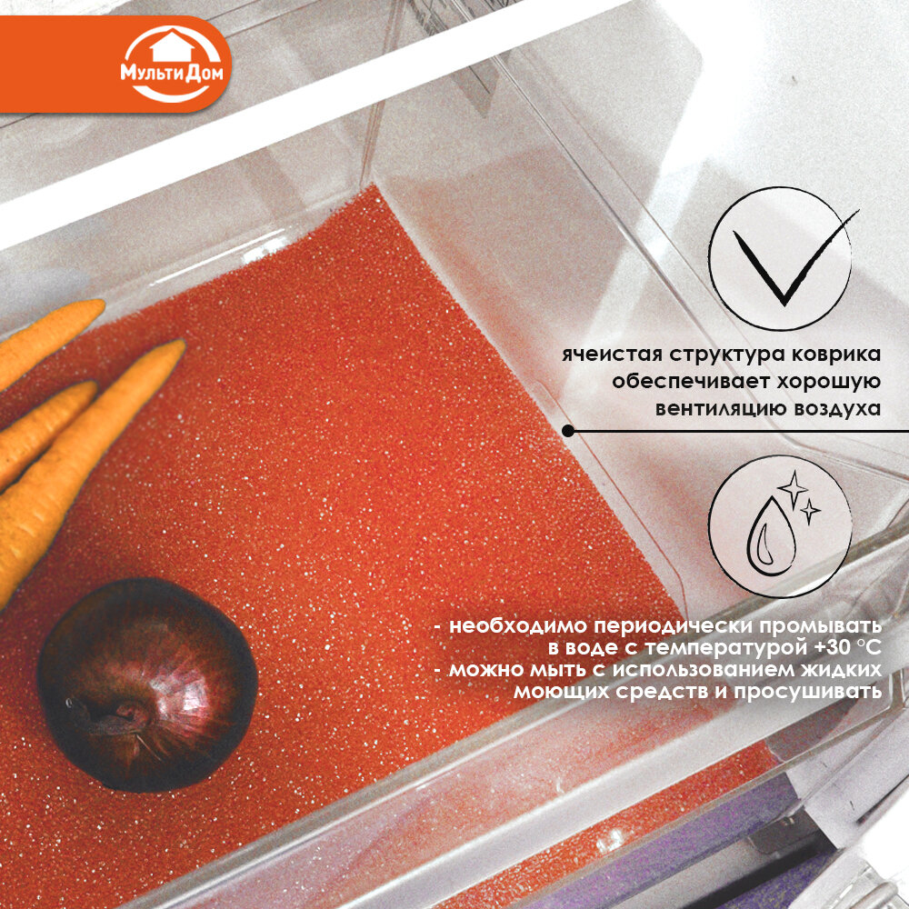 Благодаря лучшей циркуляции воздуха между продуктами и исключения непосредственного контакта с поверхностями холодильника, способствует сохранению свежести овощей и фруктов на более длительный срок. Также коврик можно использовать в качестве коврика для сушки посуды.