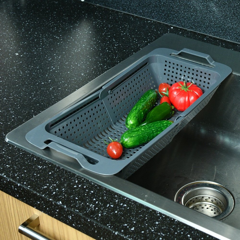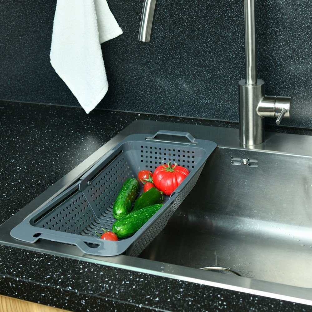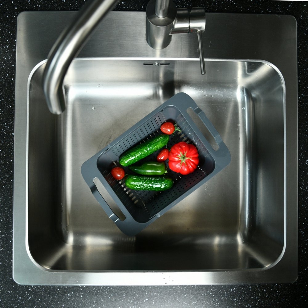 Мойка имеет перфорированные стенки и дно, позволяющие стечь лишней воде после мытья. Раздвижной дуршлаг можно использовать для мытья овощей, фруктов и столовых приборов. В него можно чистить фрукты и овощи – он поможет сохранить чистоту раковины. Мойка подойдёт для сушки продуктов и столовых приборов после мытья.