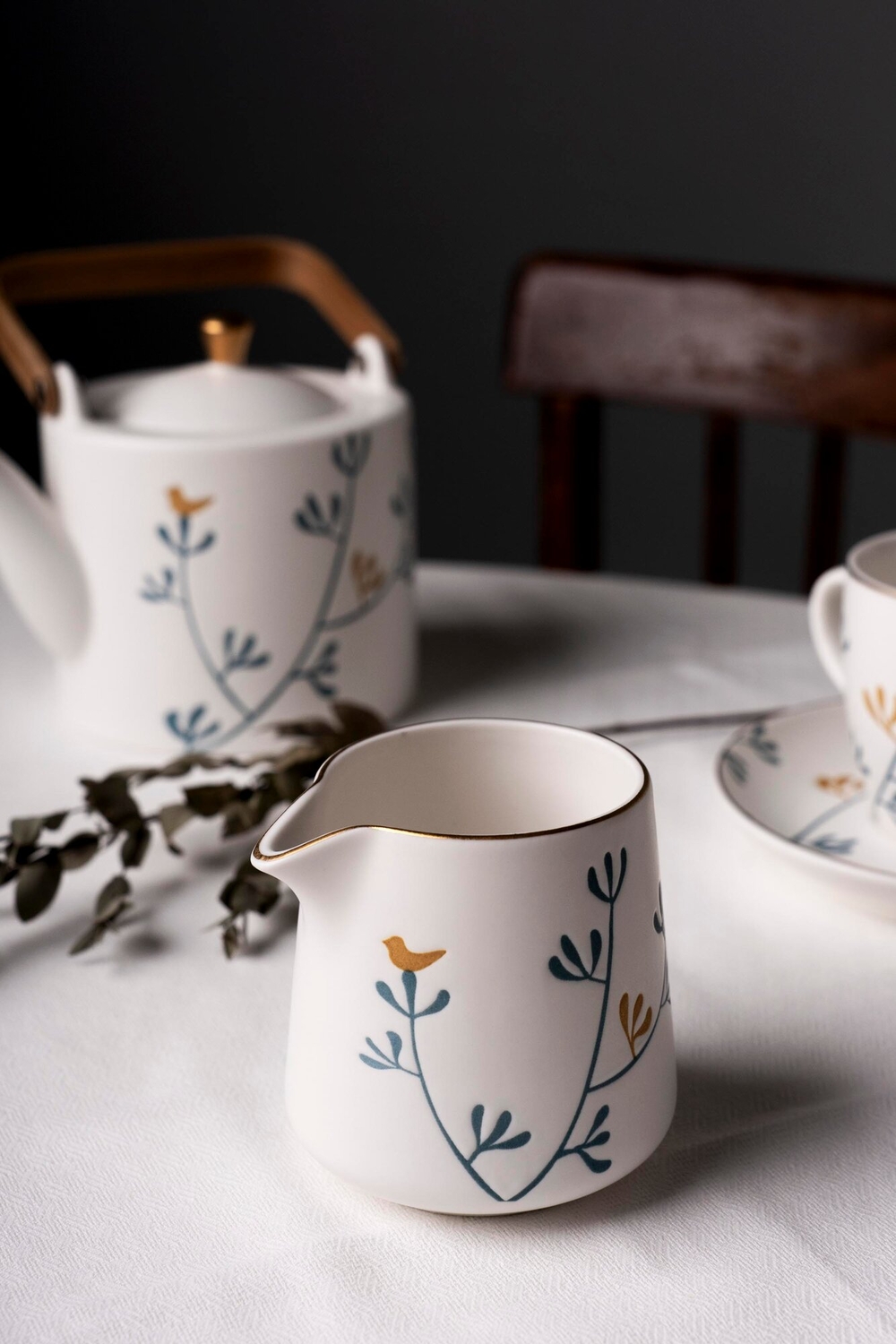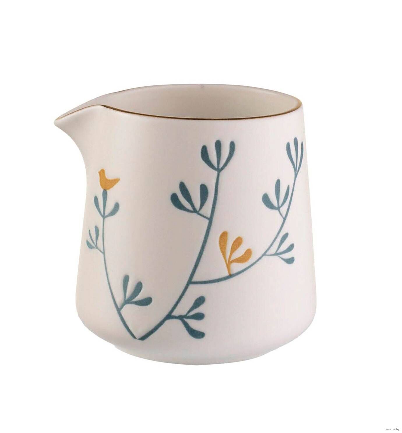 Нанесенный очаровательный дизайн растительности делает сливочник уникальным. Фарфоровая посуда отличается от керамики повышенной плотностью. Фарфор не впитывает цвет продуктов и не деформируется от влаги, чему может быть подвержена керамическая посуда.