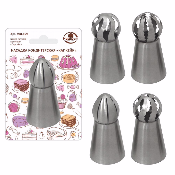 Насадки подойдут к стандартным переходникам и могут использоваться с одноразовыми кондитерским и мешками. После применения промойте водой с моющими средствами. Для очистки удобно использовать узкий ершик.