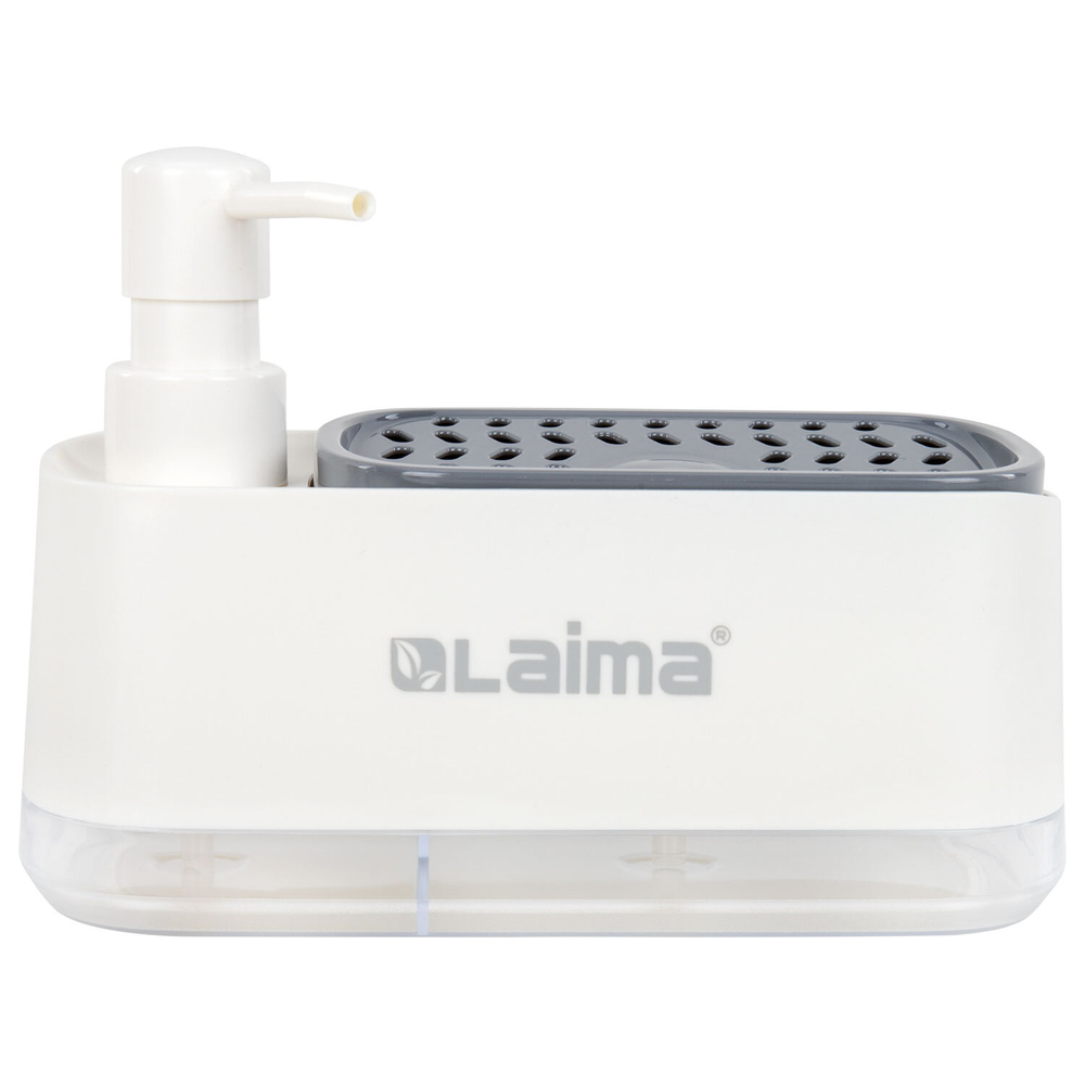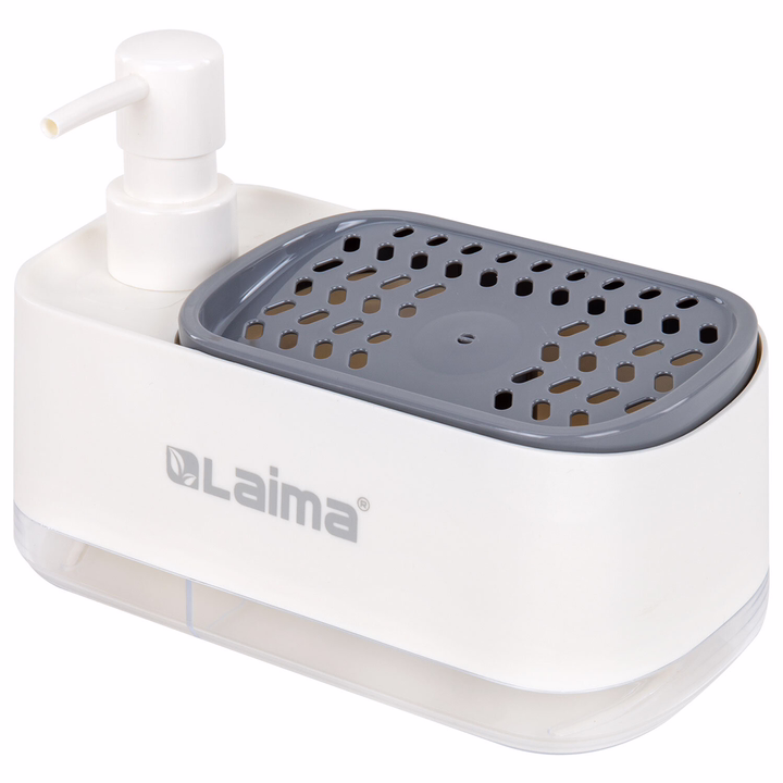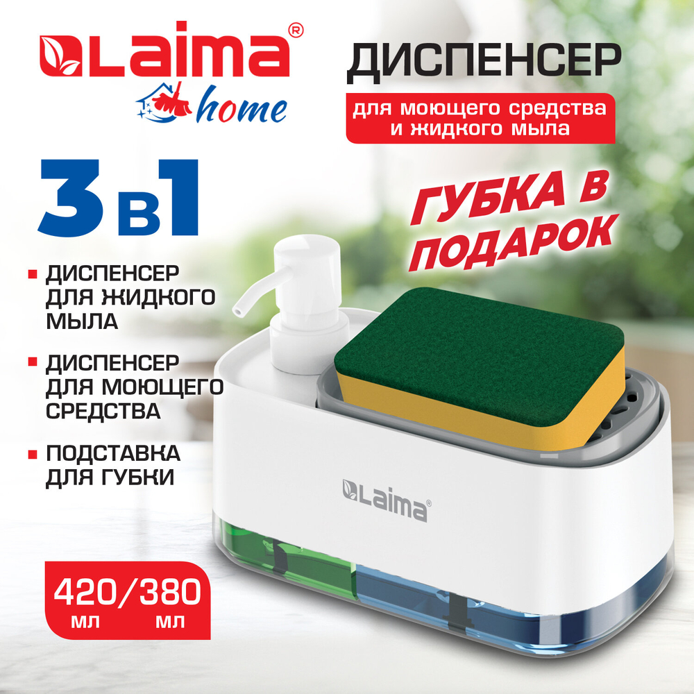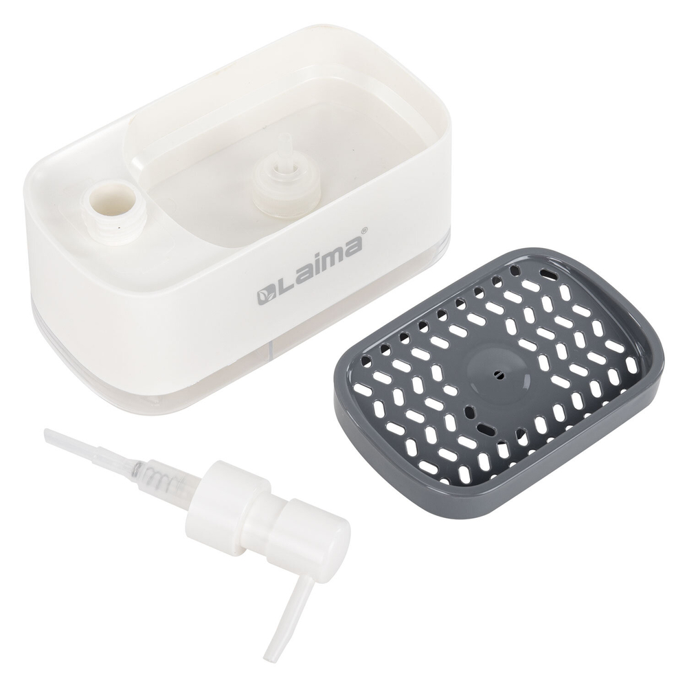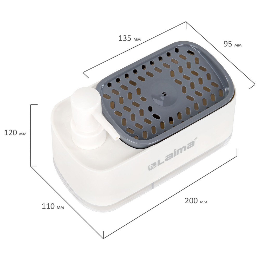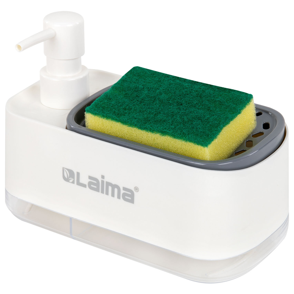 Диспенсер выполнен в виде двух емкостей для моющих средств из прочного пластика с помпами из полипропилена и полистирола, резиновые вставки на основании предотвращают скольжение. Моющее средство подается при нажатии на лоток для губки. В комплекте с диспенсером идет полиуретановая губка.