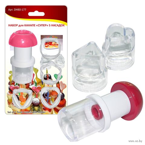 Готовьте оригинальные закуски на шпажках с помощью набора для канапе "Супер". Набор состоит из 5 насадок круглой, квадратной, треугольной и фигурной формы и пресса.