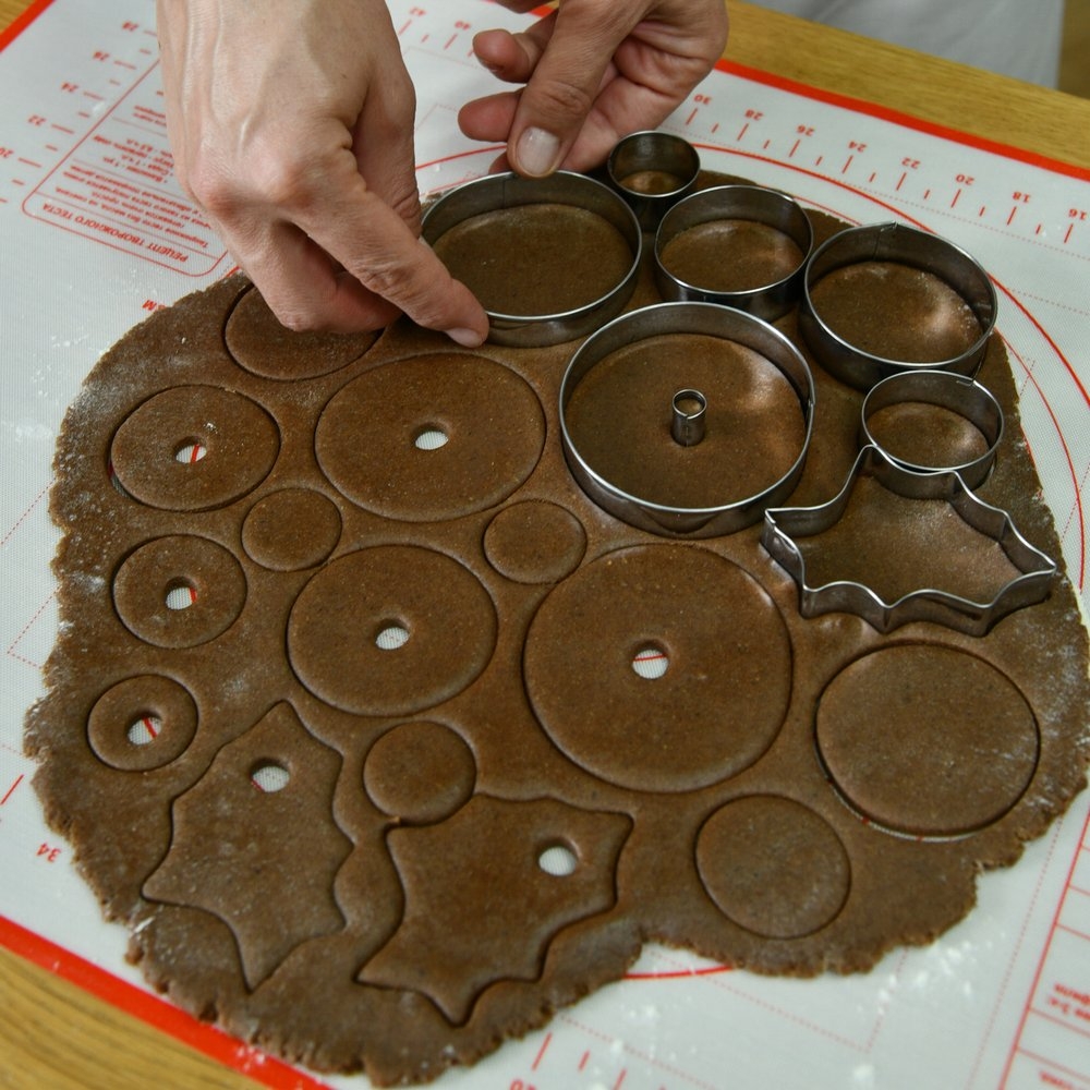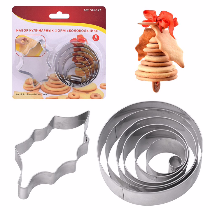 Кулинарные формы – удобный и незаменимый аксессуар в арсенале каждой хозяйки в подготовке праздничного стола. С помощью этого набора кулинарных форм Вы сможете вырезать и испечь печенья и пряники, которые соберутся в 3D фигуру – колокольчик. Оригинальное украшение и угощение для праздничного стола! Раскатайте тесто, вырежьте из него окружности с отверстием внутри, а также листок, испеките и соберите предварительно остудив.