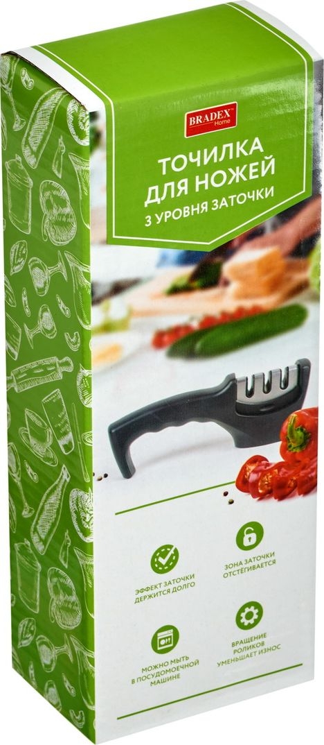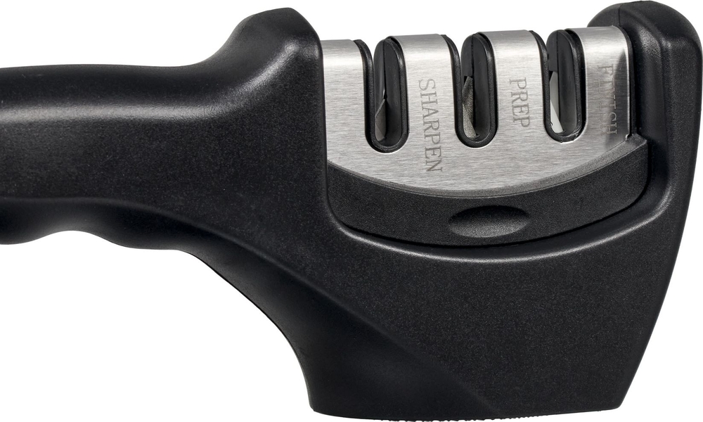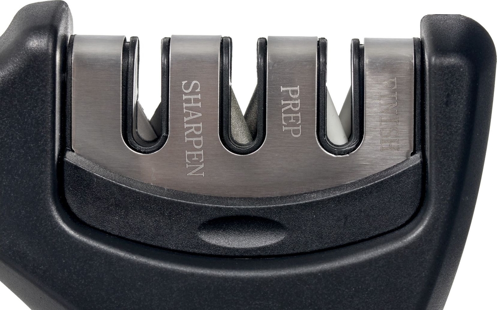 Точилка подходит для кухонных ножей из стали с прямой кромкой, включая ножи с лезвиями из закаленной стали. Абразивные ролики двигаются почти перпендикулярно режущей кромке лезвия, а не вдоль, как в точилках с неподвижными камнями, благодаря чему эффект заточки держится гораздо дольше.