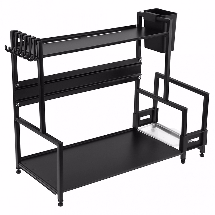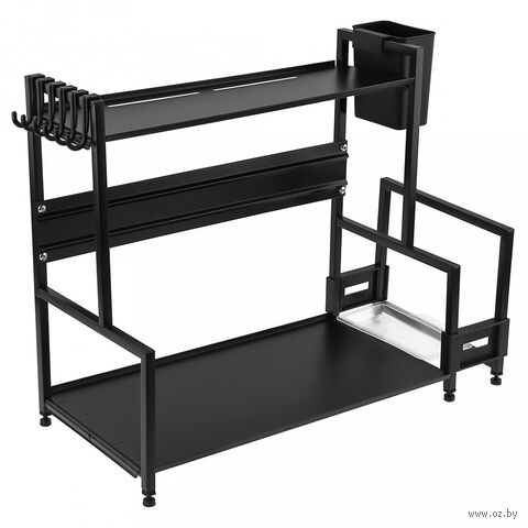 Металлическая кухонная подставка-стеллаж с двумя уровнями полок, оснащен крючками для кухонных принадлежностей (лопаток, шумовок) держателями для ножей.