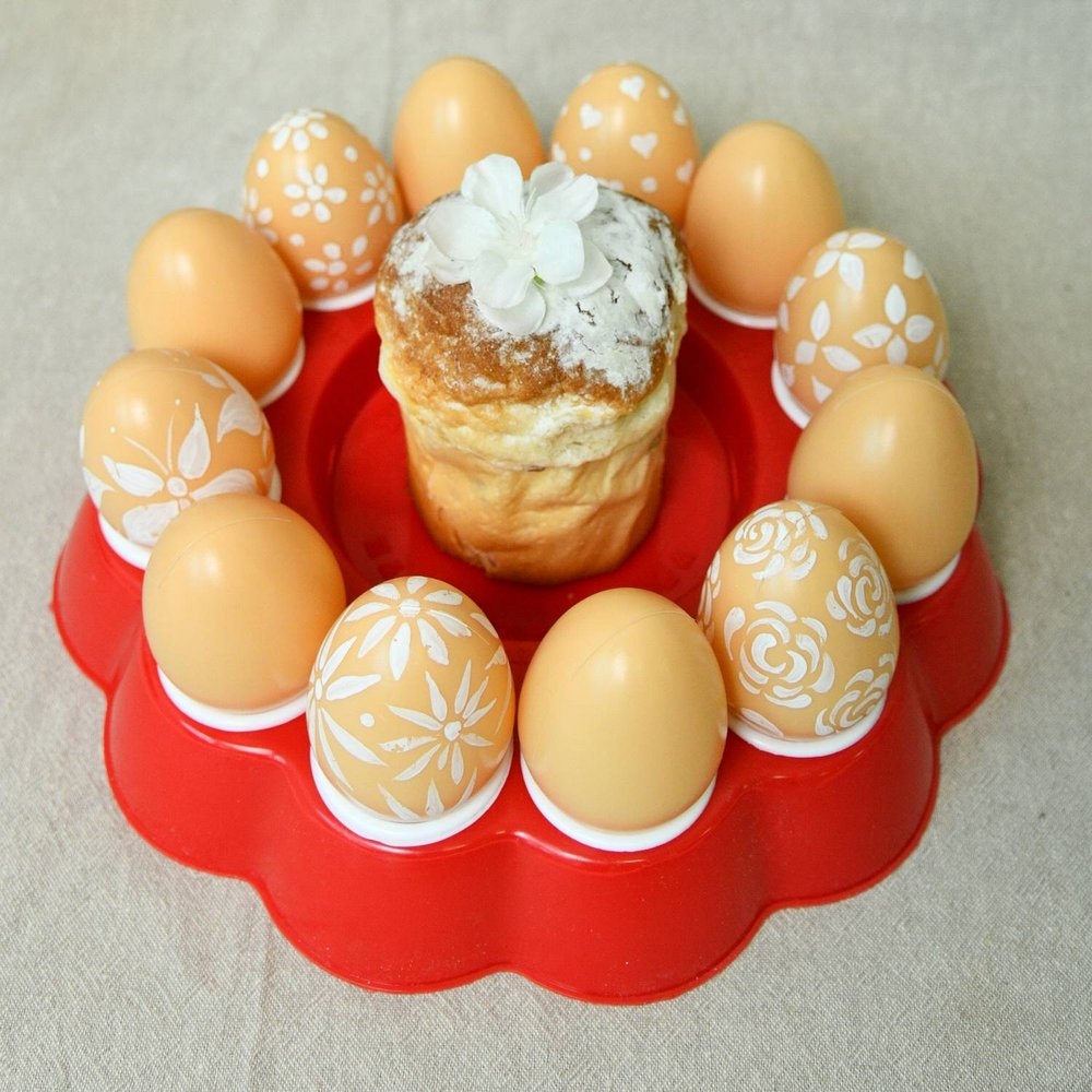 Имеет одно углубление под кулич, диаметром не более 10 см и 12 углублений под яйца.