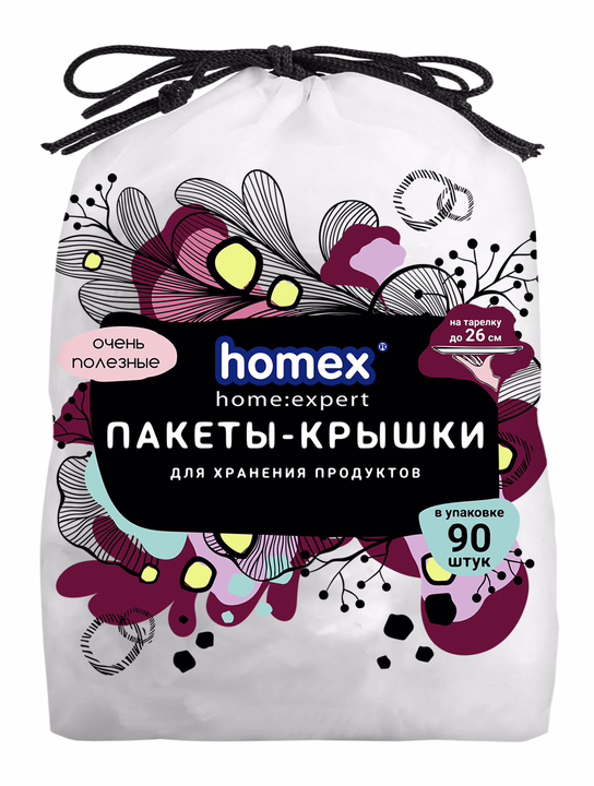Чехлы HDPE, плотность 5 микрон, белая резинка. В упаковке 90 штук. Максимальная ширина растяжения 42 см – на тарелку 26 см. Упаковка белый пакет, полноцветная печать, черный шнурок.