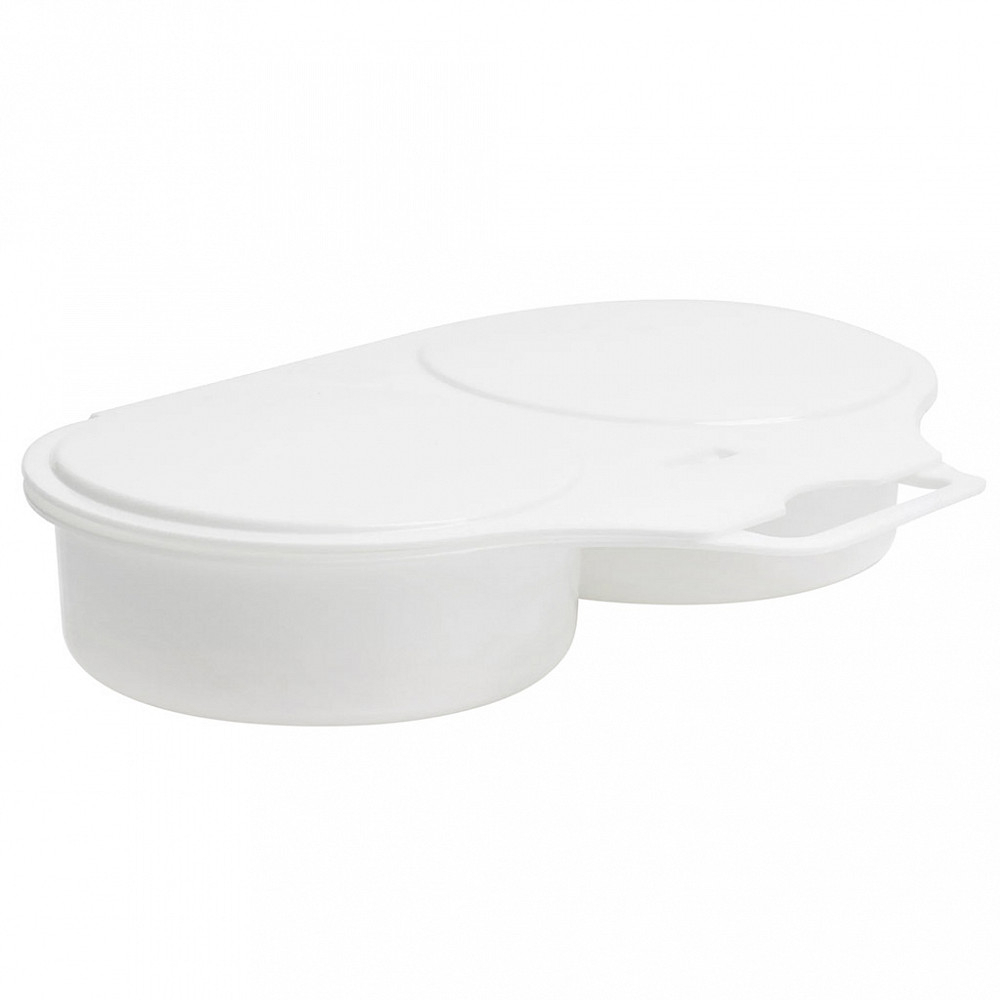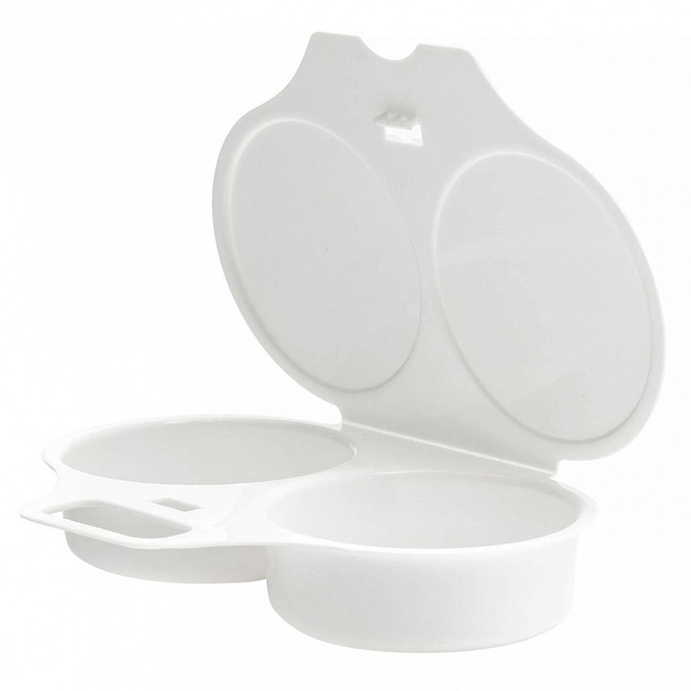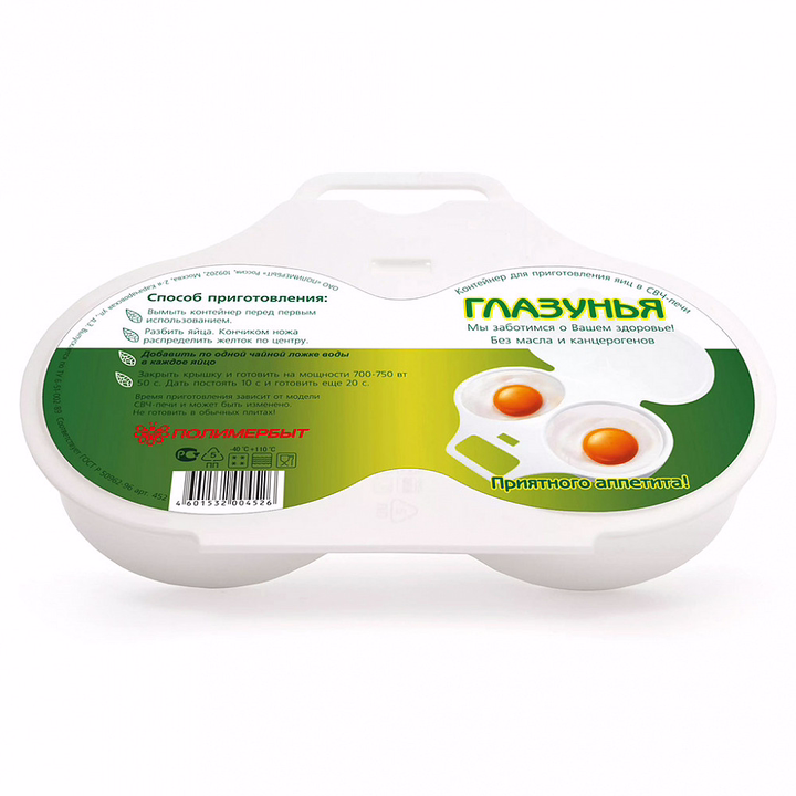 Форма изготовлена из пластмассы. В ней можно приготовить яичницу-глазунью из двух яиц в микроволновой печи.