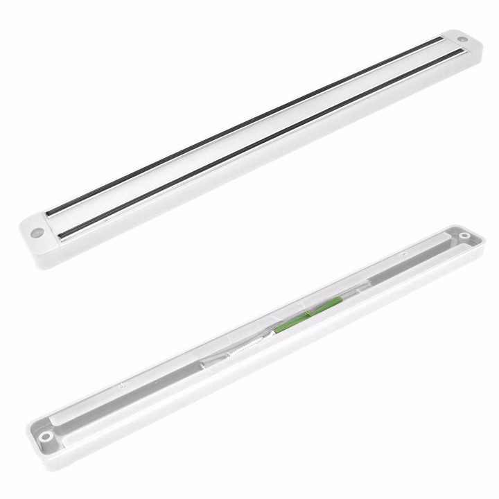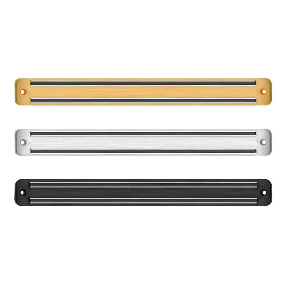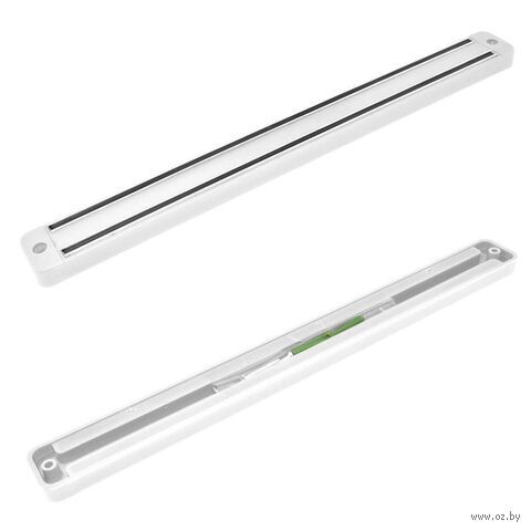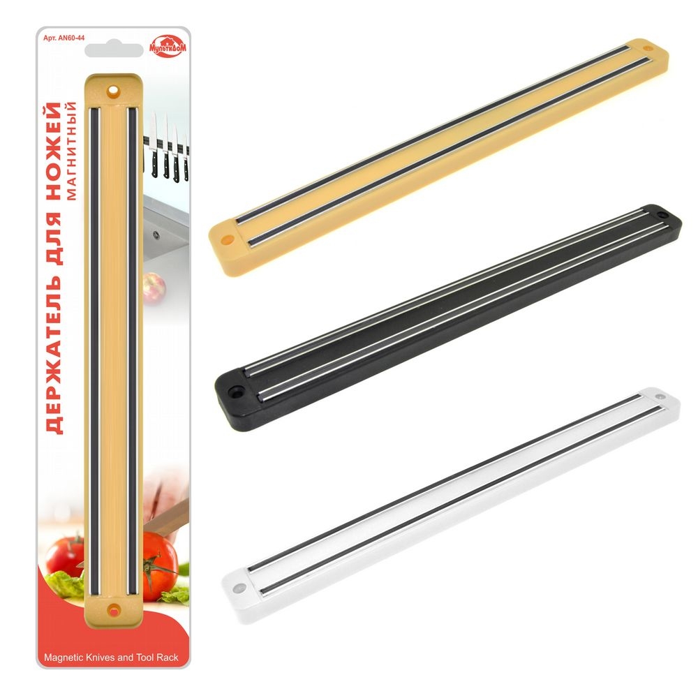Магнитный держатель для ножей изготовлен из пластмассы и металла, длина планки 33 см, в комплект входит 2 шурупа.