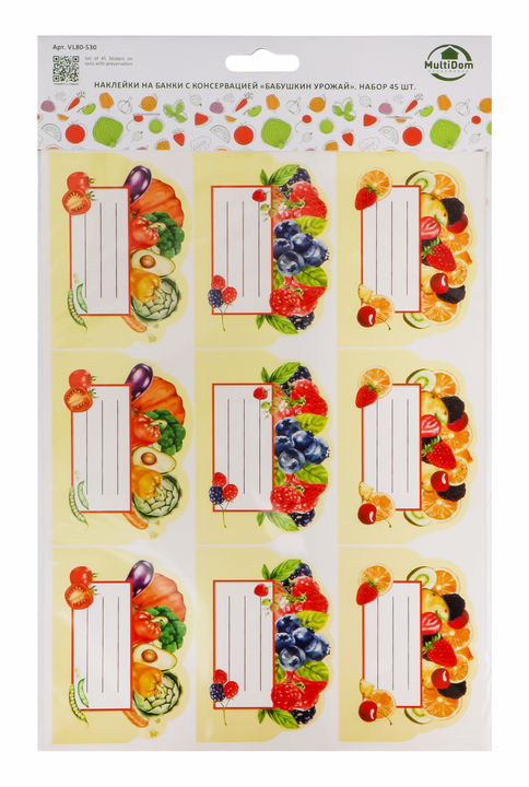 Самоклеящиеся наклейки предназначены для маркировки банок с овощными заготовками, салатами, вареньем, компотами. Также подойдут для маркировки крышек, контейнеров и баночек со специями и крупами. С помощью ярких наклеек вы сможете сохранить информацию о домашней заготовке, и указать дату изготовления. Клеить можно на любые не слишком рельефные поверхности. Поверхность должна быть чистая, сухая и обезжиренная. Наклейки расположены на листе, прорезаны по контуру, снимите ее с подложки и нанесите на поверхность.
