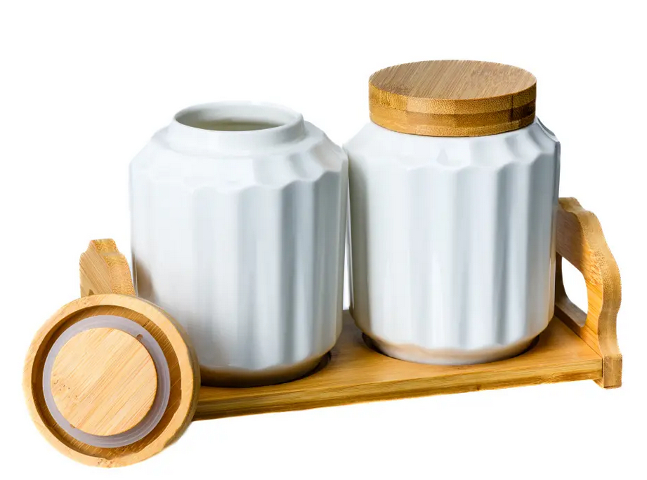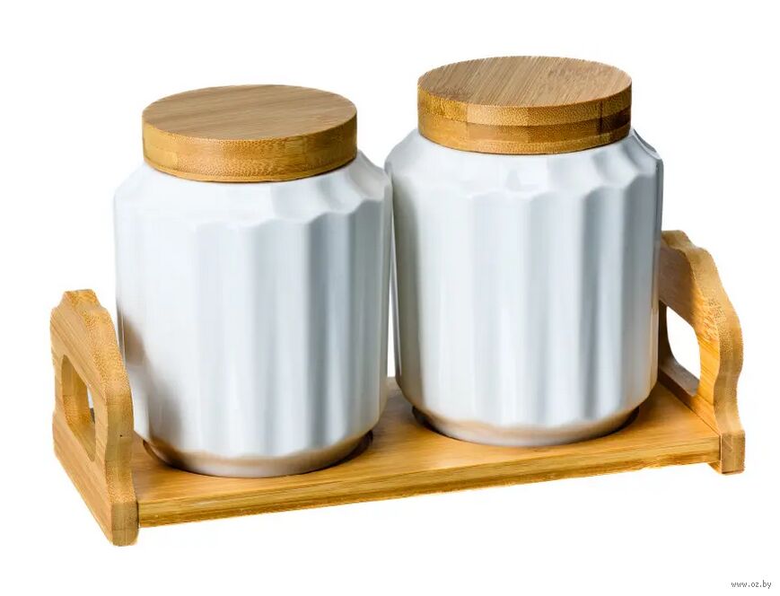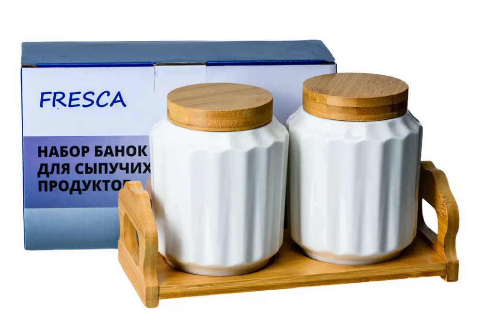 Набор банок для сыпучих продуктов фарфоровых (600 мл) на бамбуковой подставке.