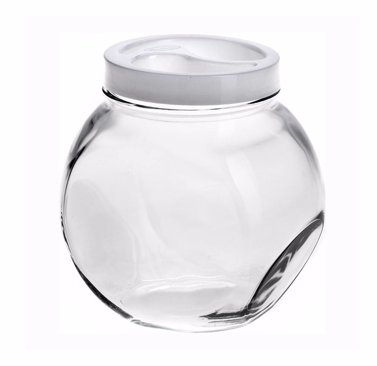 Банка шарообразной формы выполнена из прочного натрий-кальций-силикатного стекла. Оснащена пластиковой плотно прилегающей крышкой, в которой имеются выемки для более удобноко открывания.