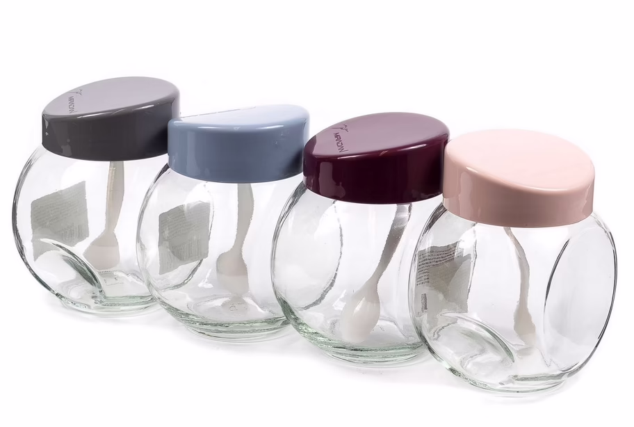 Банка для сыпучих продуктов стеклянная с пластмассовой крышкой и ложкой.