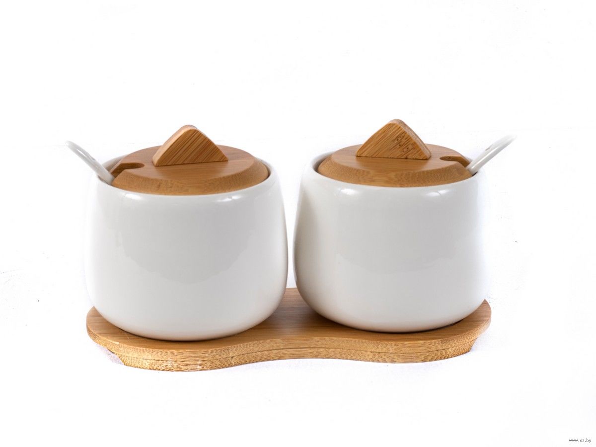 В набор входят баночки с деревянной крышкой и ложечки для сыпучих продуктов на деревянной подставке.