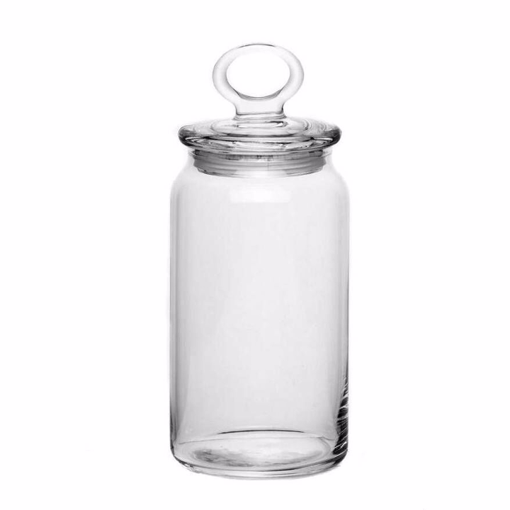 Банка для сыпучих продуктов изготовлена из прочного стекла.