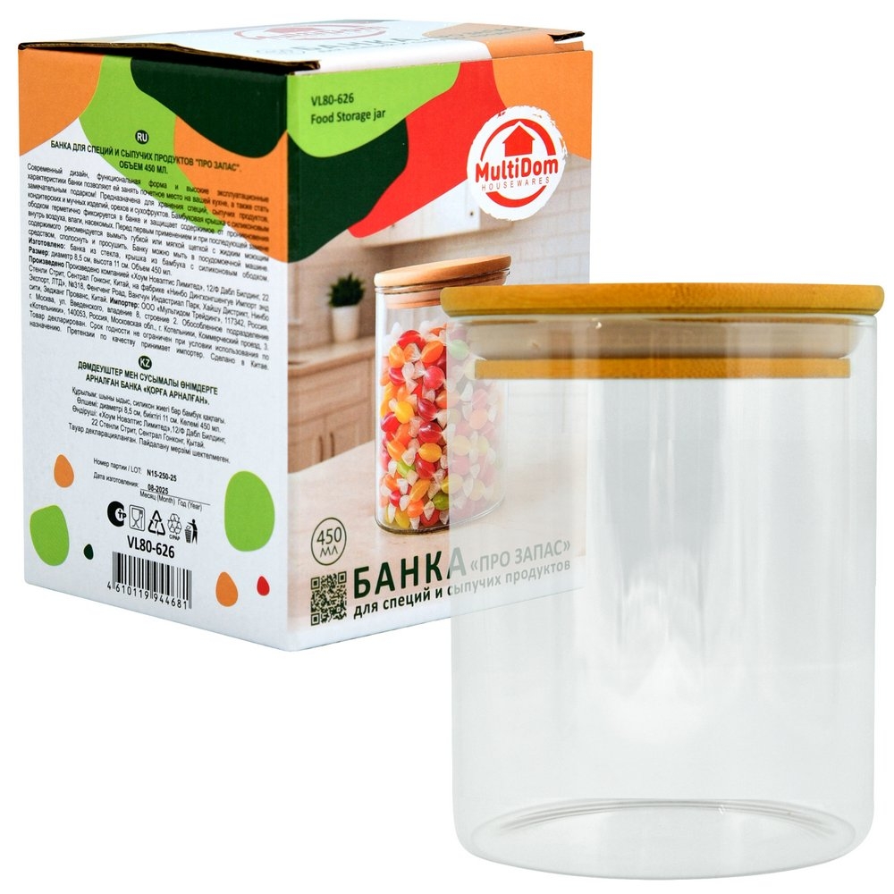 Бамбуковая крышка с силиконовым ободком герметично фиксируется в банке и защищает содержимое от проникновения внутрь воздуха, влаги, насекомых.