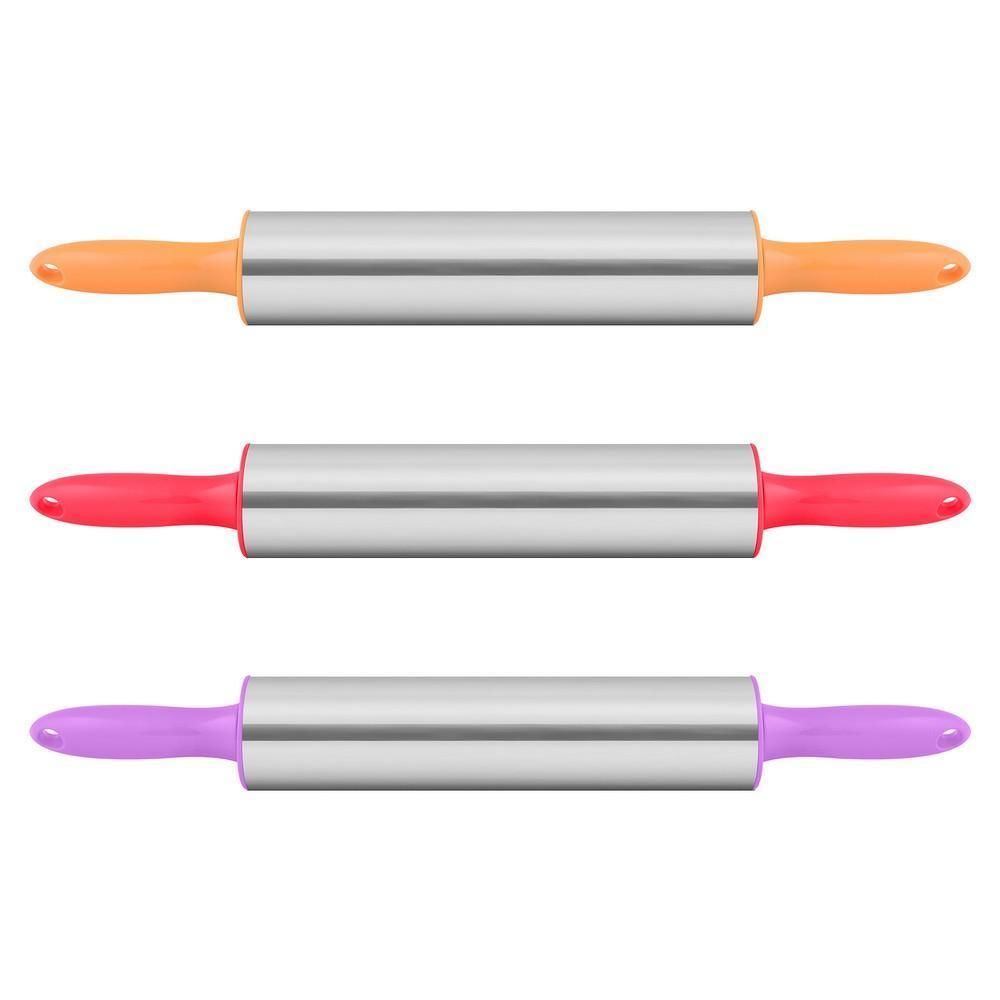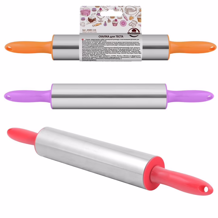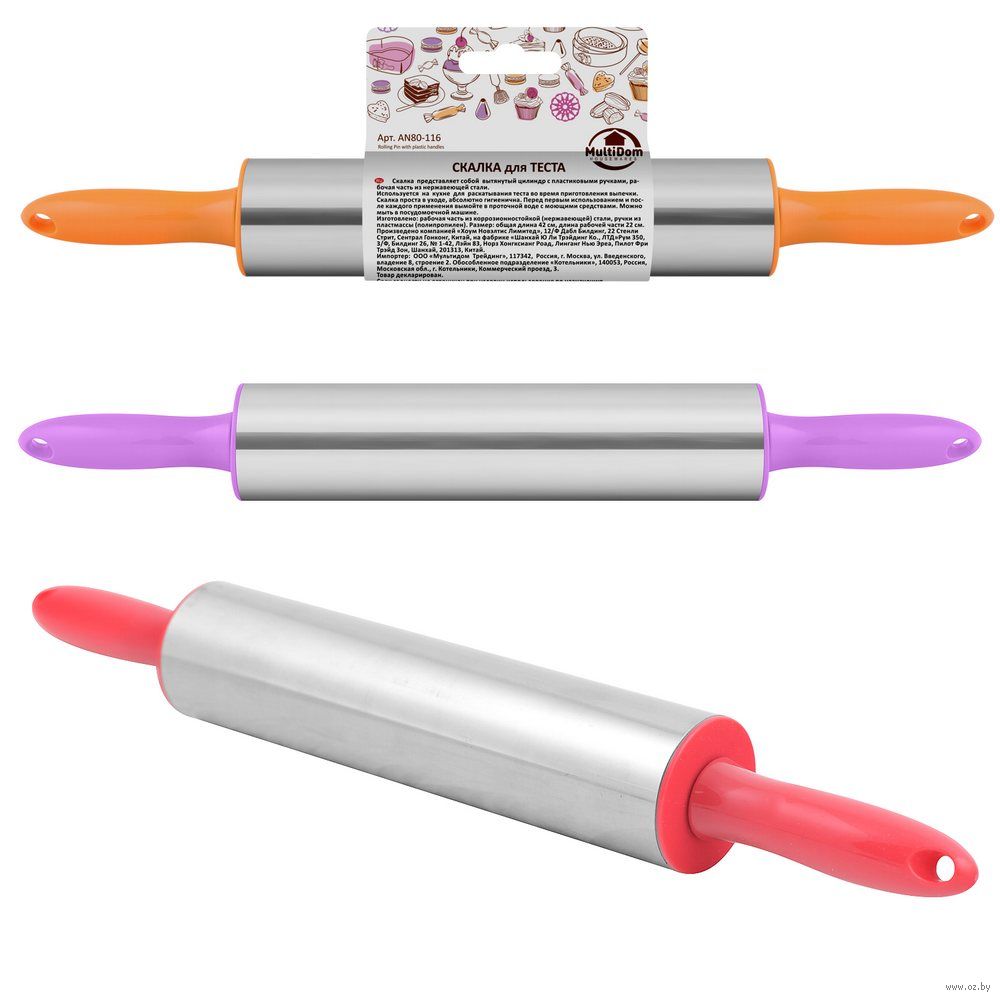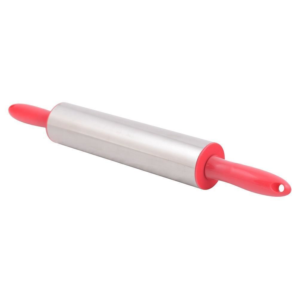 Любителям даже самой незатейливой выпечки понадобится скалка, а уж тем, кто увлечён кулинарными экспериментами и вовсе не обойтись без этого предмета. Рабочая часть изделия выполнена из нержавеющей стали, что говорит об идеально ровной поверхности. К металлу ничего не прилипает, поэтому тесто не нужно посыпать мукой. По бокам инструмент оснащён пластиковыми ручками, которые имеют отверстия для крючков. Скалка проста в уходе, её достаточно промывать после использования с моющими средствами, изделие занимает мало места. Размер: общая длина 42 см, рабочая часть 22 см.