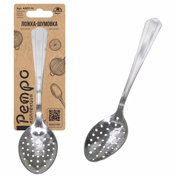 Ложка-шумовка занимает мало места, хранится вместе с обычными столовыми ложками, не требует особого ухода. Достаточно после применения помыть приспособление с моющим средством, можно мыть в посудомоечной машине. Изделие изготовлено из стали с хромированным покрытием, имеет классический дизайн, выполненный в ретро-концепции.