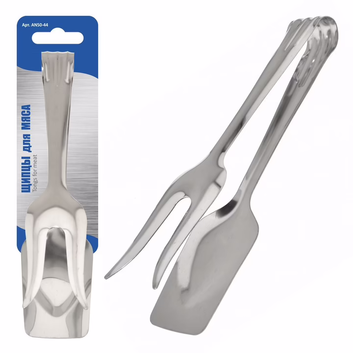 Дополнительно к набору традиционных аксессуаров для кухни используйте универсальные щипцы. Изделие многофункционально и практично в использовании. Одна сторона выполнена в виде лопатки, другая – в виде двузубой вилки для нанизывания продуктов. Перемешивайте салаты, переворачивайте шпикачки, мясо, рыбу и овощи во время жарки на сковороде или гриле. Приспособление пригодится для порционного раскладывания блюд. Щипцы изготовлены из стали с хромированным покрытием, выглядят стильно, рассчитаны на длительное использование. Можно мыть в посудомоечной машине.