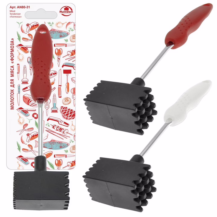 Для приготовления нежнейших мясных отбивных используйте молоток для мяса "Формоза". С этим приспособлением вы размягчите мясные волокна и жилки. Молоток имеет две рабочие стороны с крупными и мелкими зубцами. После использования тщательно промывайте изделие в проточной воде с жидкими средствами. Рабочая часть изготовлена из пластмассы (усиленный нейлон), ручка изготовлена из хромированной стали и пластмассы (полипропилен).