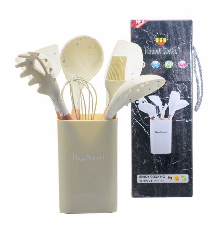 Состав набора: половник, лопатка, ложка, ложка для спагетти, венчик, шумовка, кисточка.