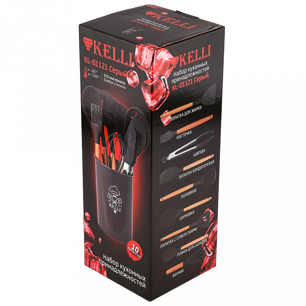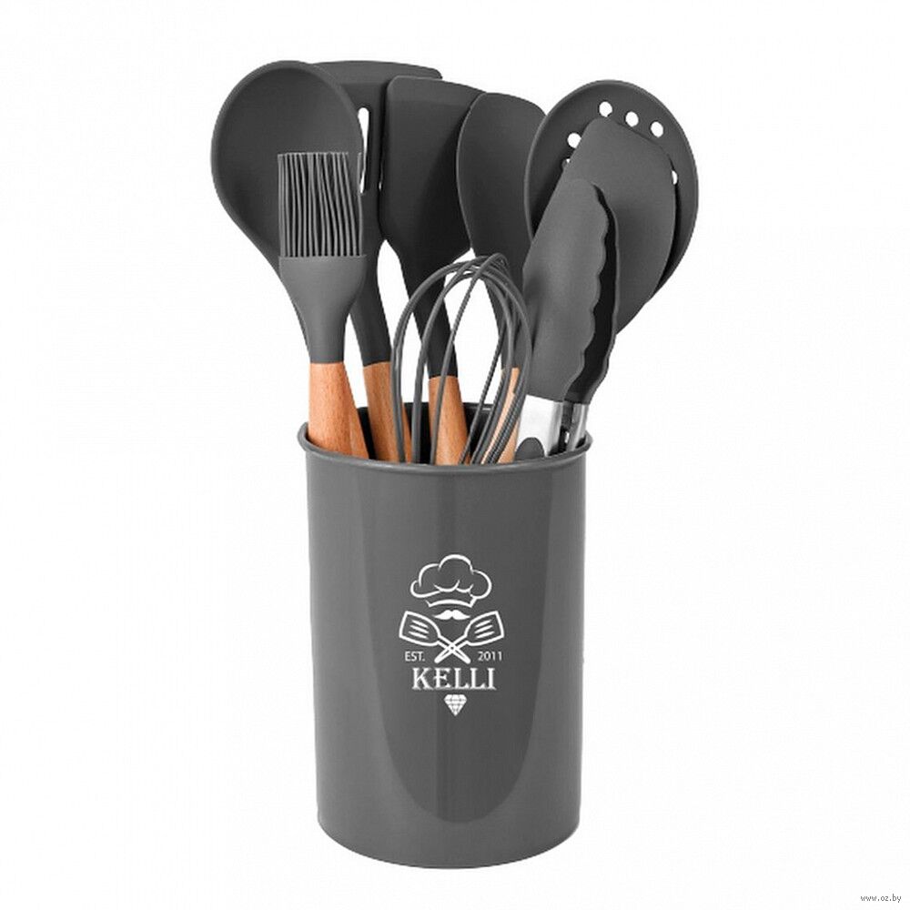 Комплектность: лопатка для жарки, кисточка, щипцы, лопатка кондитерская, половник, шумовка, лопатка с отверстиями, ложка для салатов, венчик, подставка.