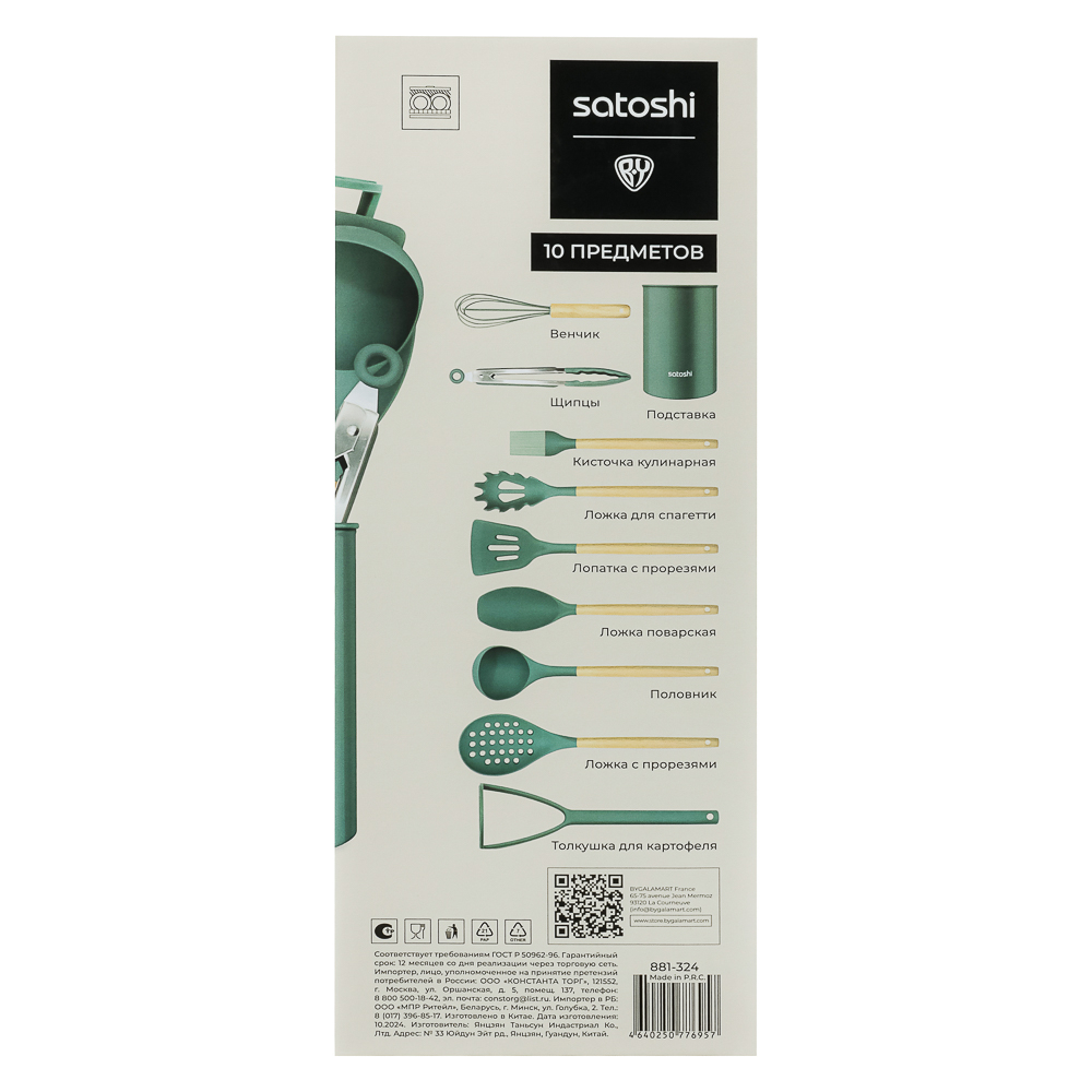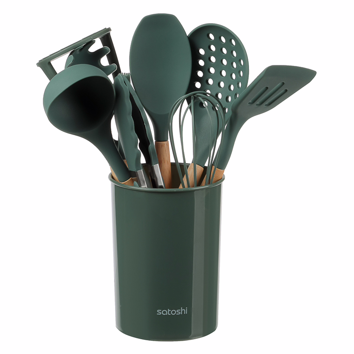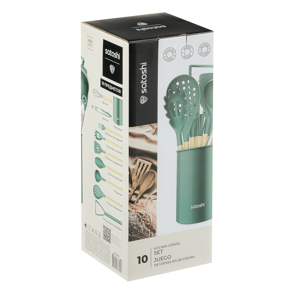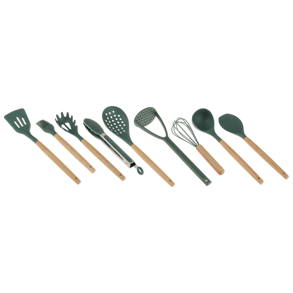 Набор включает 10 предметов из термостойкого силикона, безопасного для посуды с антипригарным покрытием: толкушку для картофеля, поварскую ложку, щипцы, ложку для спагетти, половник, лопатку с прорезями, кулинарную кисточку, подставку, венчик и ложку с прорезями.