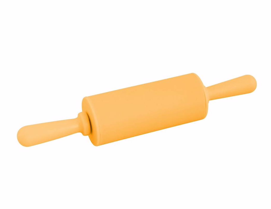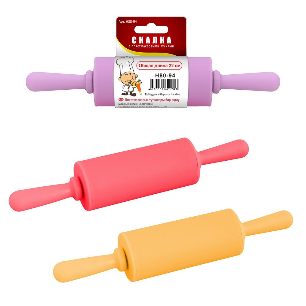 Компактная скалка из силикона с пластмассовыми ручками удобна для раскатывания теста прямо на противне, а также для приготовления пирожков, хвороста.