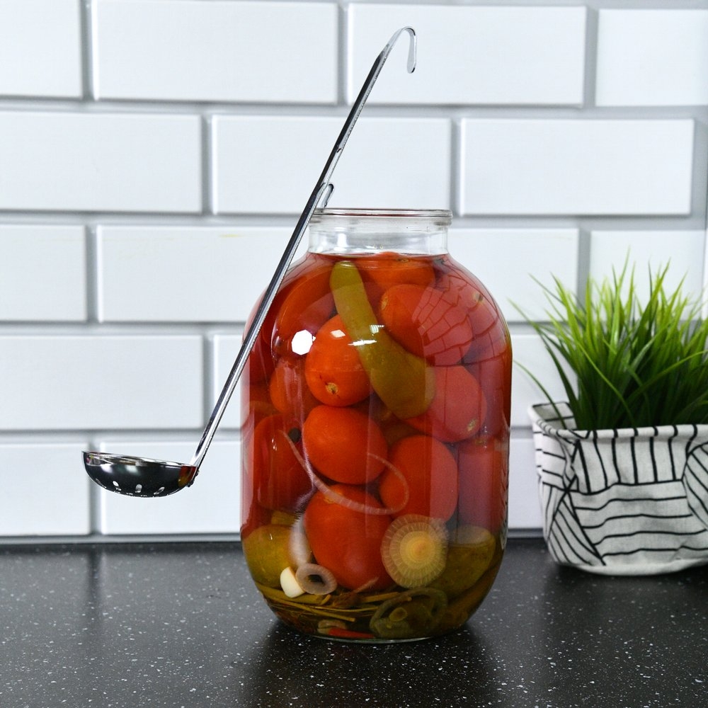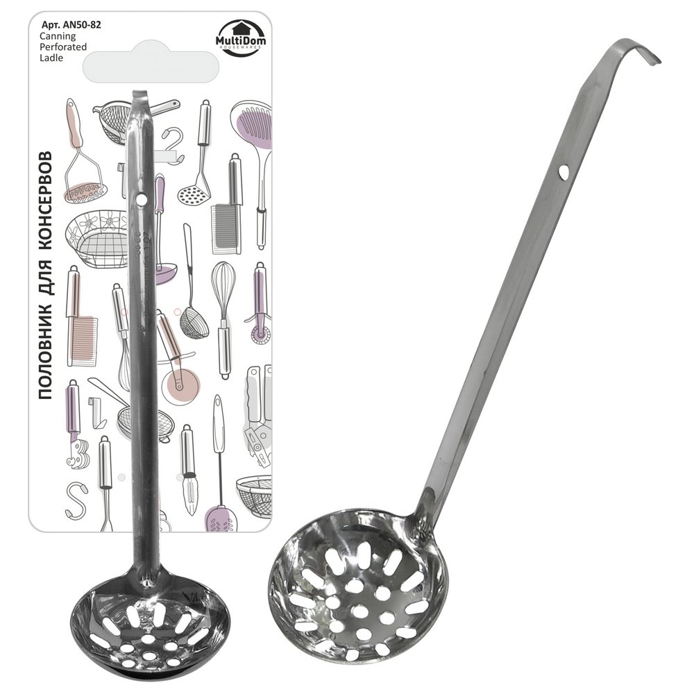 С половником для консервов вам будет проще извлечь консервированные продукты из стеклянных или металлических банок. Длинная ручка позволит достать продукты даже со дна емкости, а наличие отверстий позволит лишней воде вытечь обратно.
