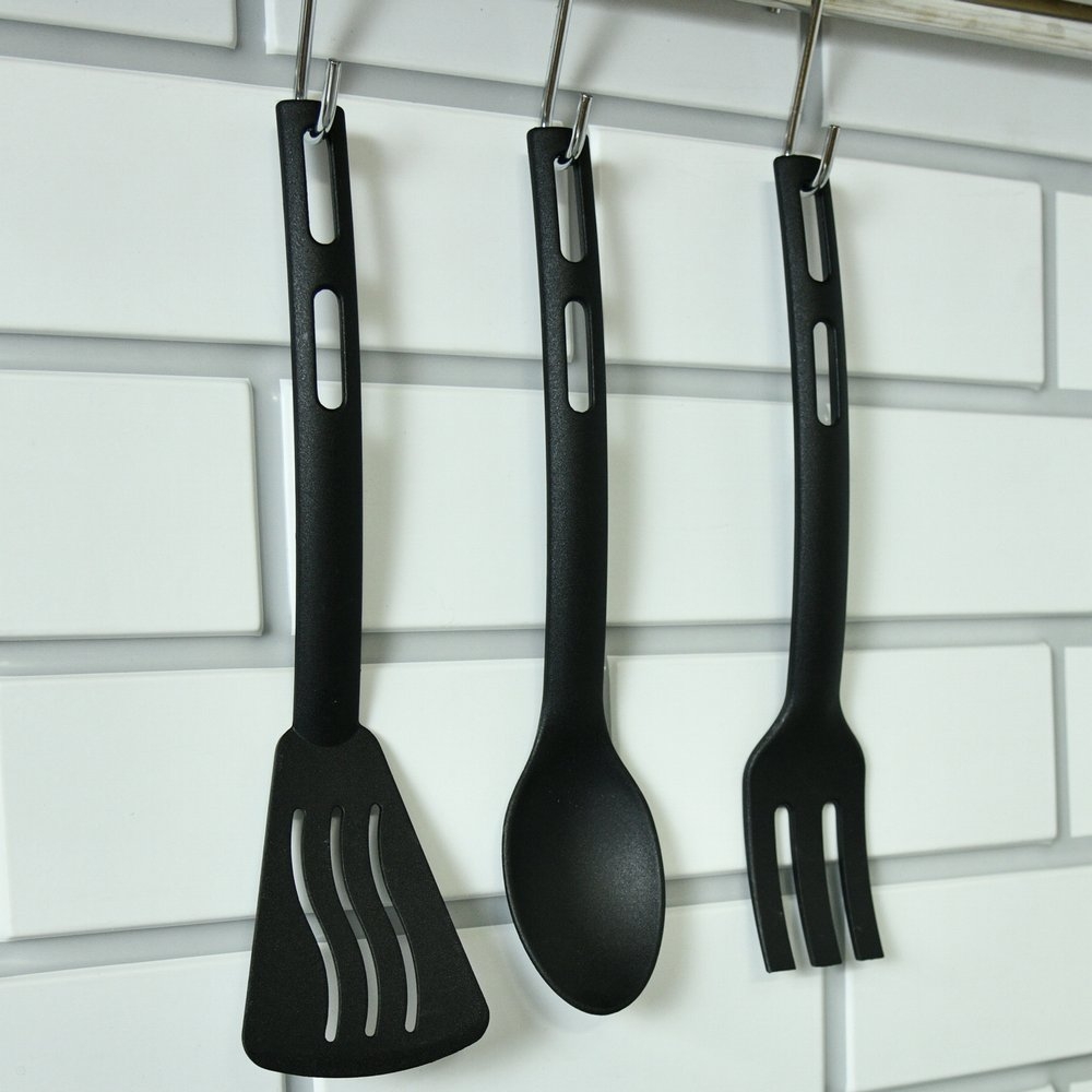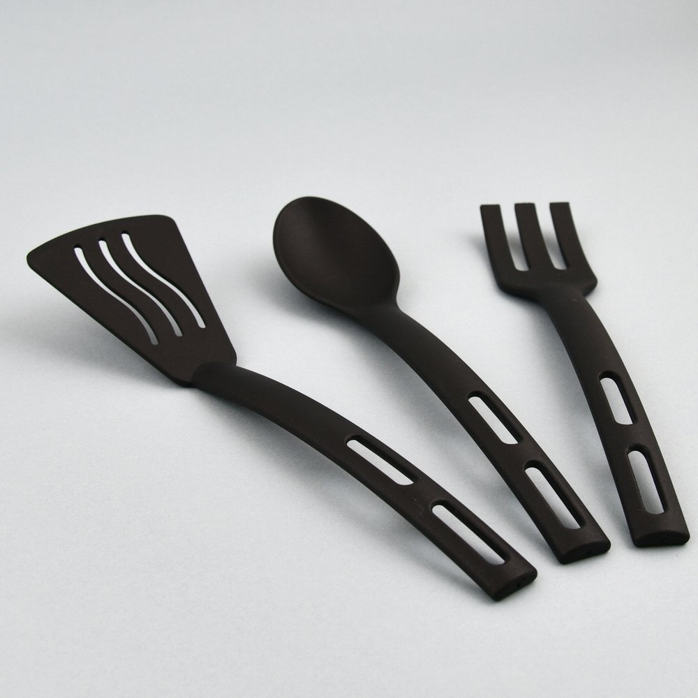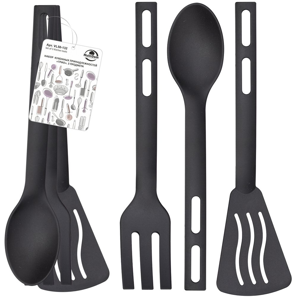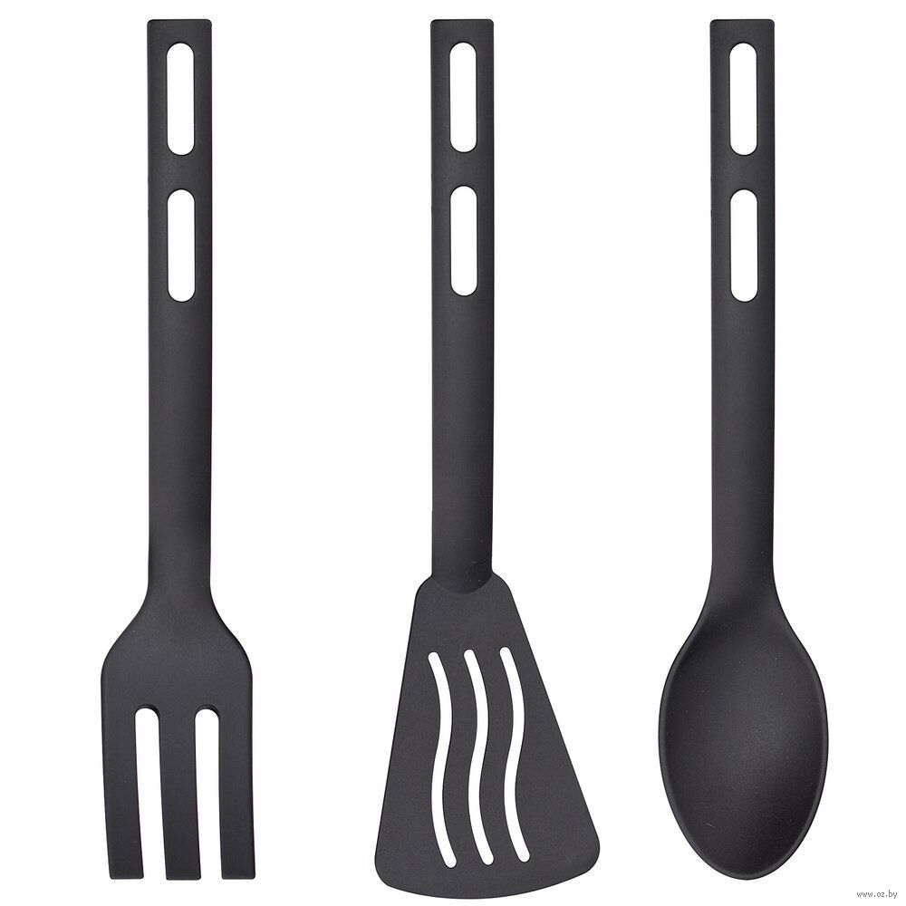 В набор входит: лопатка, с помощью которой можно перевернуть и перемешать пищу, разложить еду по тарелкам; ложка, которая активно используется во время готовки супов и горячих блюд; вилка, незаменима при необходимости достать готовый кусок из бульона или перемешать блюдо.