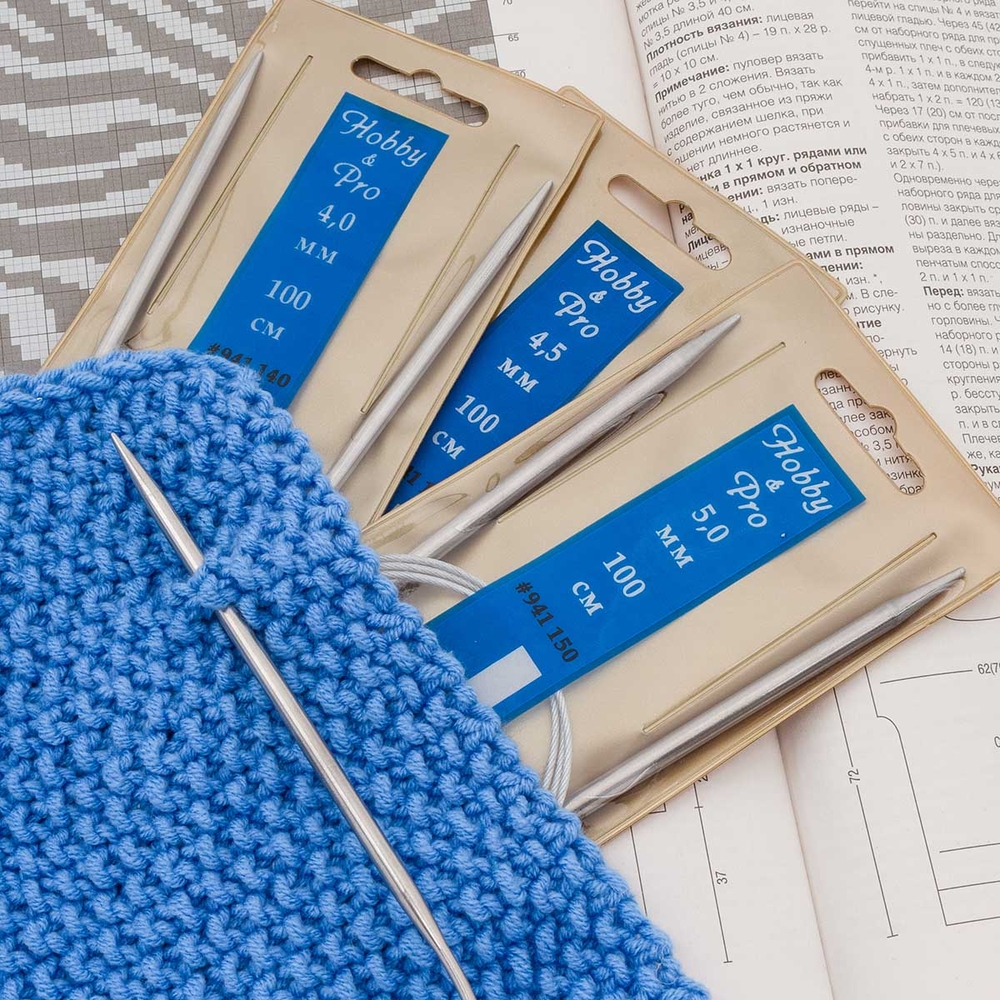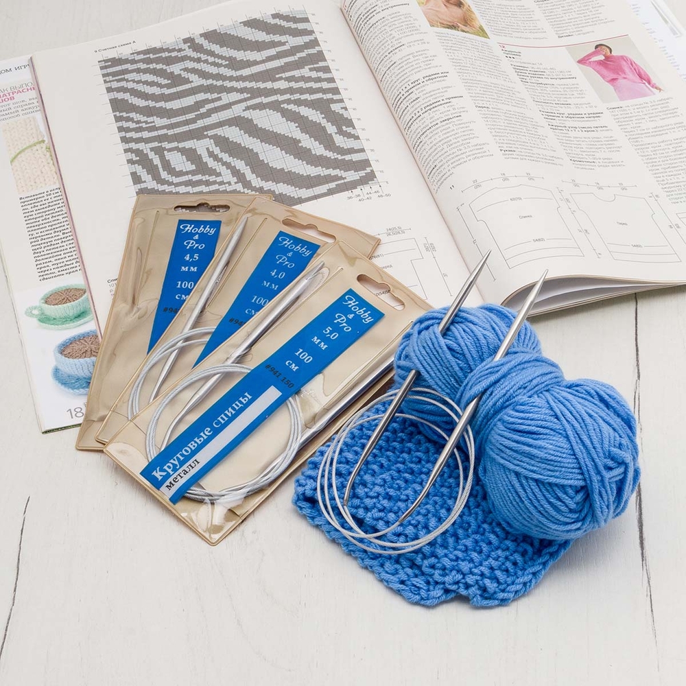Спицы для вязания круговые из нержавеющей стали с металлическим тросиком от Hobby&Pro – идеальный инструмент для работы как в круговой, так и в прямой техниках вязания. В набор входят спицы круговые трёх размеров, с помощью которых можно создавать разнообразные вязаные изделия, такие как свитеры, манишки, шапки, снуды, а также более объемные вещи и широкие полотна: пледы и коврики.