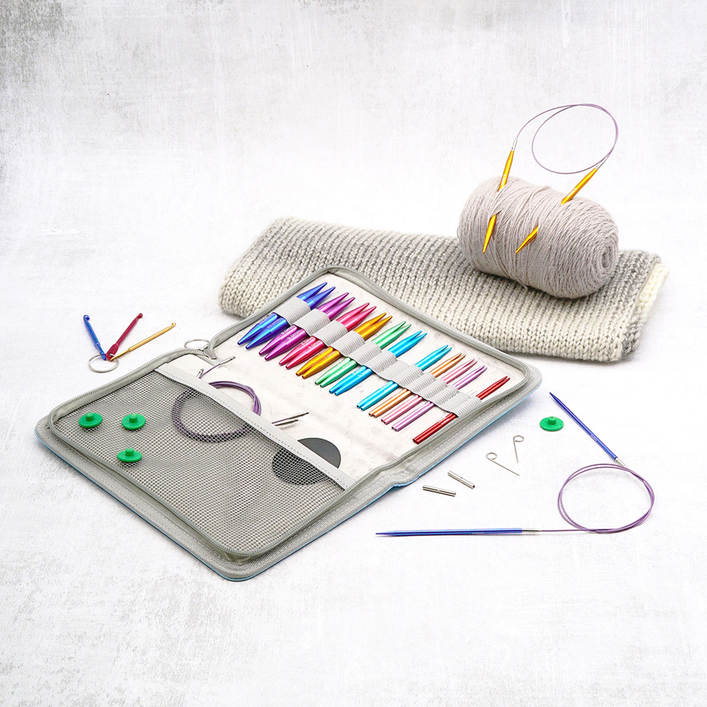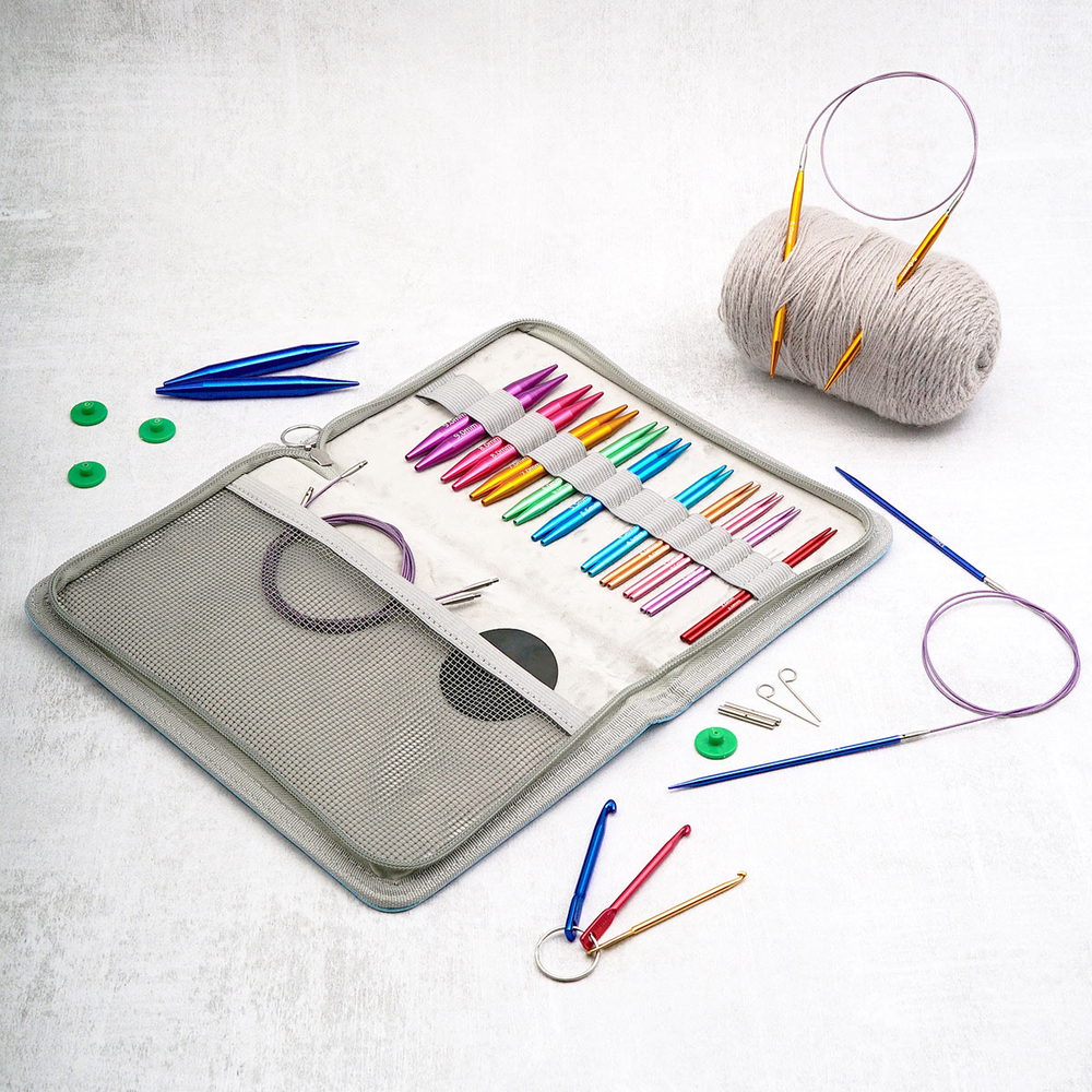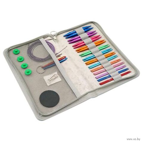 В набор входят 13 пар разноцветных гладких спиц: 3 мм, 3,25 мм, 3,5 мм, 3,75 мм, 4 мм, 4,5 мм, 5 мм, 5,5 мм, 6 мм, 7 мм, 8 мм, 9 мм и 10 мм. Также в комплекте четыре поворотных тросика разной длины (40, 60, 80 и 100 см) с плотной фиксацией, 3 укороченных крючка для вязания 3-5 мм, 4 заглушки, 2 переходника, 2 ключа и 1 патч. Все это удобно хранится в чехле.