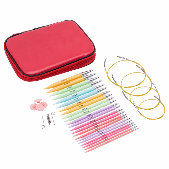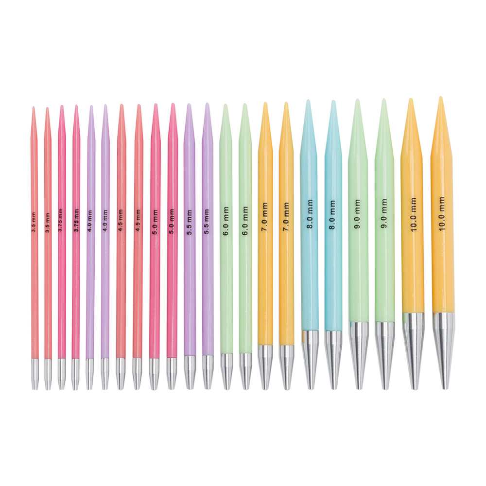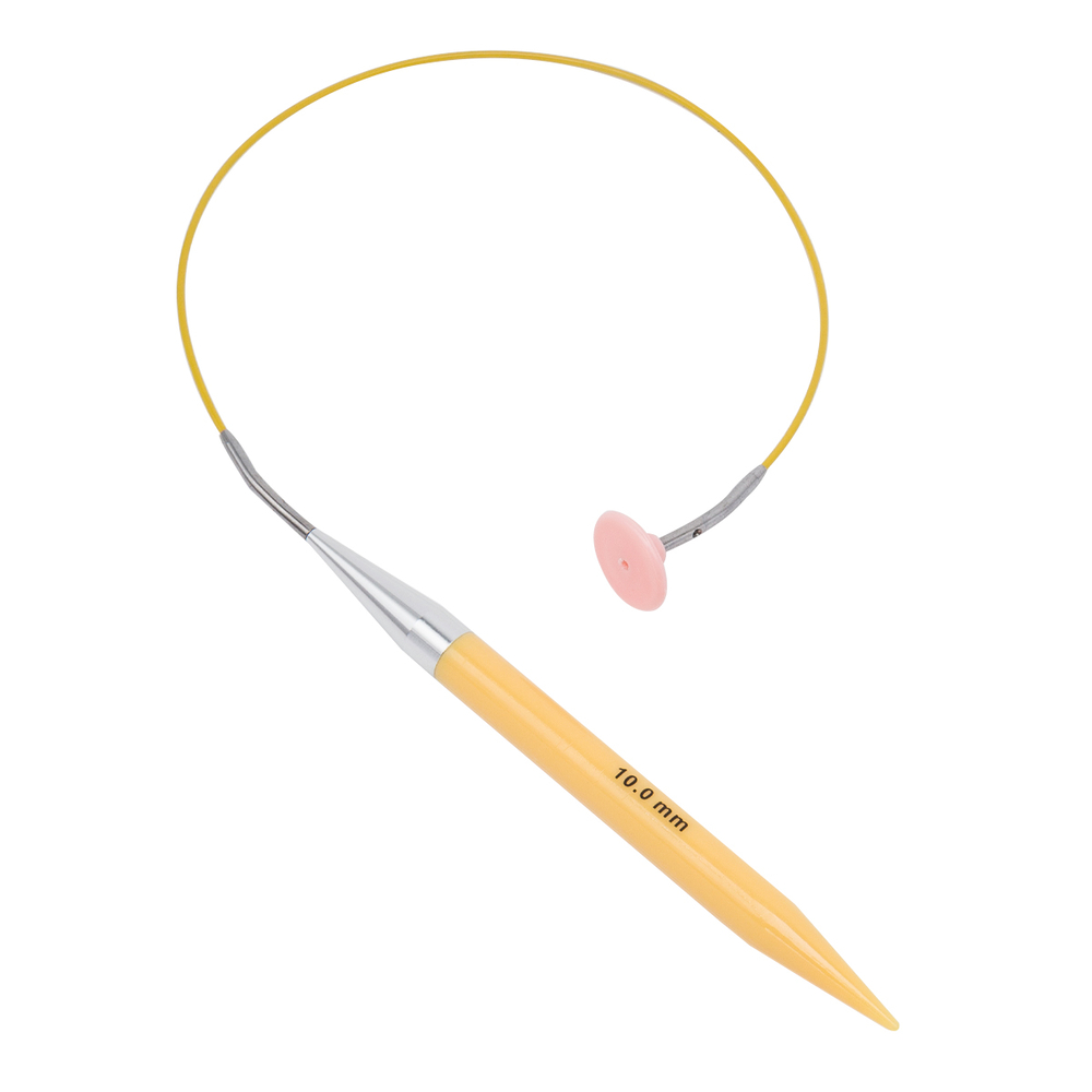 Съемные спицы длиной 13 см вместе со сменными тросиками позволяют адаптировать спицы для любого вязального проекта: от высокого воротника или манишки до платья или покрывала. Просто подберите соответствующий тросик, и у вас будут круговые спицы необходимого размера. Круговые спицы быстро трансформируются в прямые: для этого вместо лески установите заглушки, которые прилагаются в наборе.