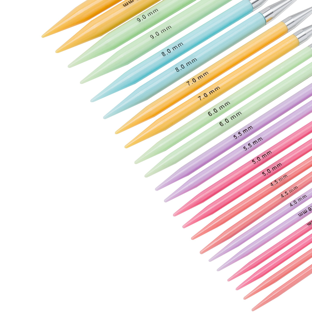 Спицы изготовлены из прочного и легкого пластика. Это обеспечивает комфортное вязание на протяжении нескольких часов без чувства усталости. Поверхность стержня спицы матовая и гладкая, пряжа при вязании плавно скользит, сохраняя цвет, структуру и ворс. Немного скругленные концы спиц защищают пальцы от травм. На каждой спице в наборе для вязания указан диаметр, что позволяет вам быстро находить нужный инструмент.