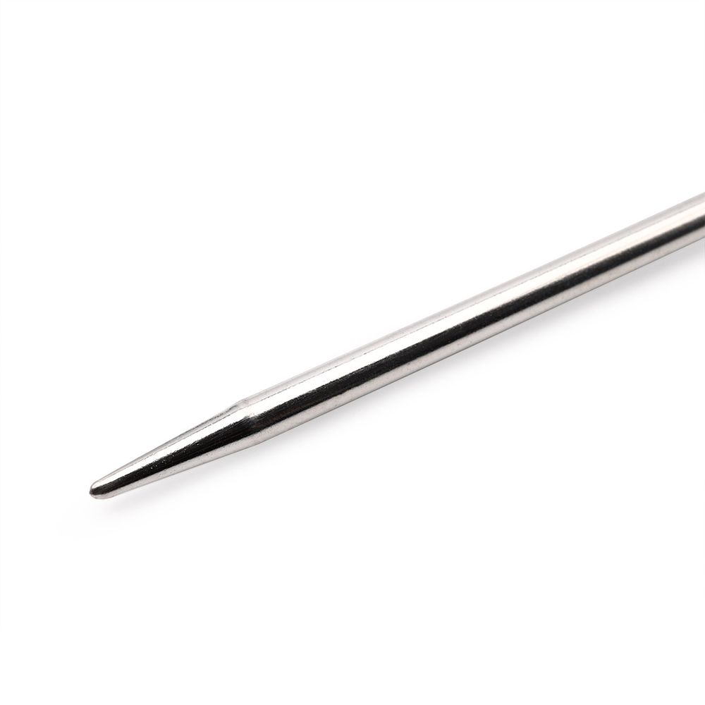 Круговые спицы серебристого цвета из латуни с гибким тросиком подходят для вязания горловины, высоких воротников, изделий, не имеющих швов. Кончики спиц закругленные. Спицы скреплены гибким пластиковым шнуром. Они прочные, легкие, гладкие, удобные в использовании. Круговые спицы наиболее удобны для выполнения деталей и изделий, не имеющих швов. Короткими круговыми спицами вяжут бейки горловины, воротники-гольф, длинными спицами можно вязать по кругу целые модели.