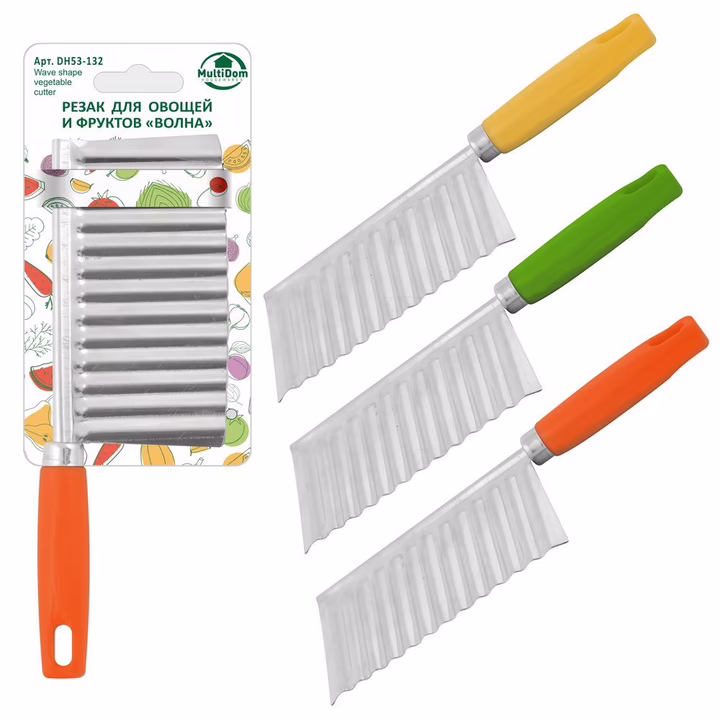 Используйте нож для волнистой нарезки и украшайте ваши блюда ломтиками овощей, фруктов и сыра. Слайсер для овощей и фруктов "Волна" – настоящая находка для тех, кто любит удивлять оригинально оформленными угощениями. Нарежьте картофель волнами и зажарьте во фритюре или сделайте красивую нарезку из огурцов или редиса. Волнистые кусочки будут отлично смотреться в горячих блюдах, на бутербродах или в оформлении холодных закусок. Инструмент используется как обычный нож, просто держите его за ручку и разрезайте продукты. Лезвие изготовлено из коррозионностойкой стали, ручка выполнена из пластмассы (полипропилен). Помыть резак можно проточной водой с использованием моющих средств.
