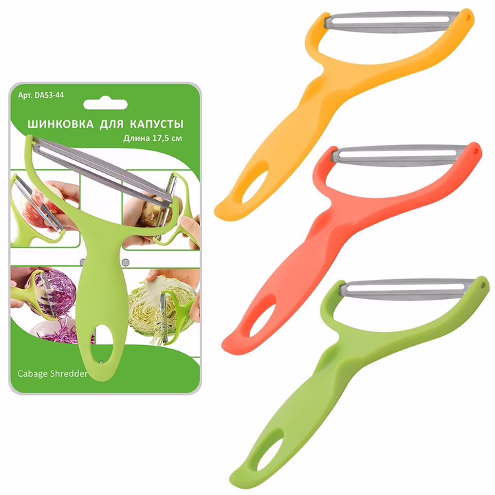Устройство полностью безопасно и удобно в применении. Держите одной рукой капусту или другой овощ, а второй начинайте резать или чистить кожуру. Среди преимуществ: удобство использования, простота ухода, удобная ручка, острые лезвия. Приспособление моется в проточной воде, можно использовать моющие средства. Лезвие изготовлено из коррзионностойкой стали, корпус выполнен из пластмассы (полипропилена).