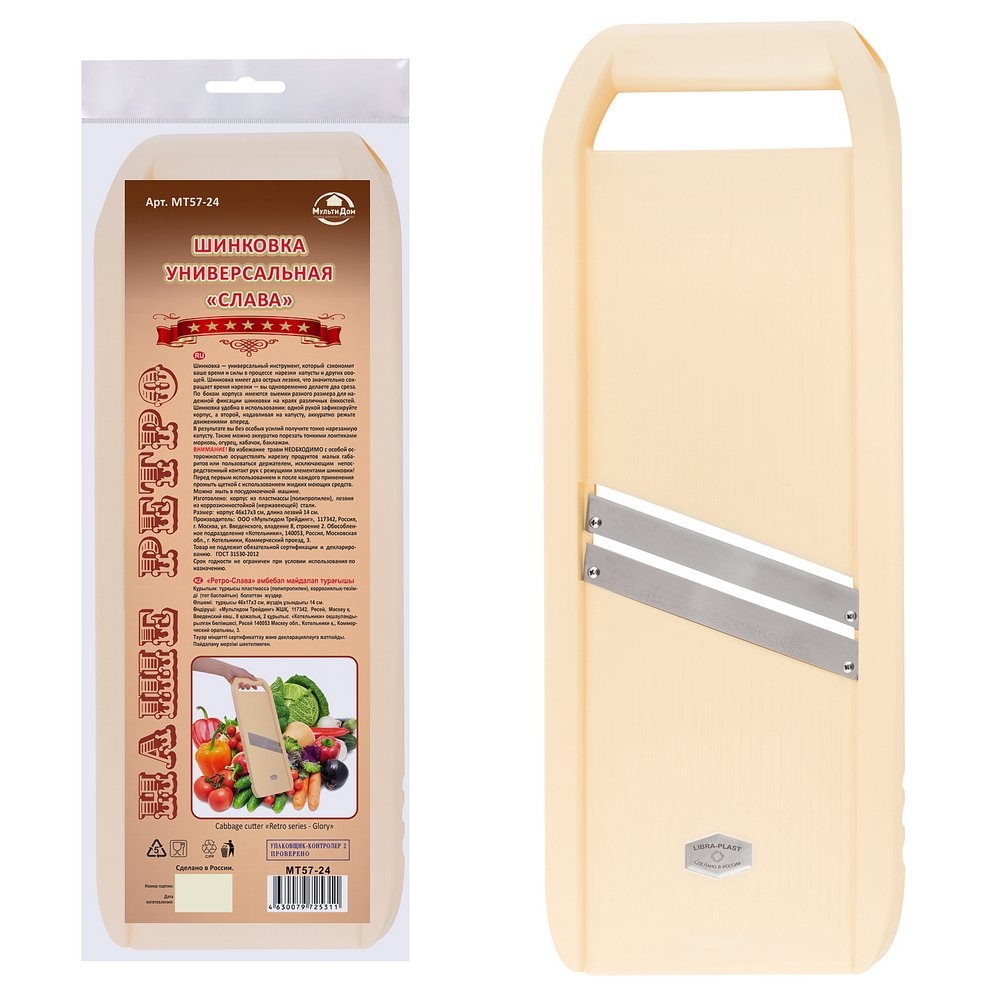 Шинковка – универсальный инструмент, который сэкономит ваше время и силы в процессе нарезки капусты и других овощей. Шинковка имеет два острых лезвия, что значительно сокращает время нарезки – вы одновременно делаете два среза. По бокам корпуса имеются выемки разного размера для надежной фиксации шинковки на краях различных ёмкостей.