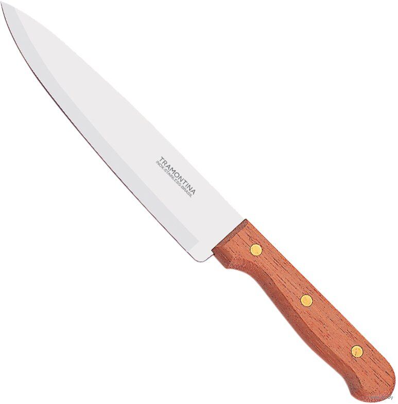Широкое лезвие ножа изготовлено из нержавеющей стали марки AISI 420 толщиной около 1,0-1,2 мм. Лезвие не тускнеет, обладает высокой прочностью, очень долго остается острым, устойчиво к коррозии и высоким температурам. Эргономичная рукоять выполнена из натурального дерева. Специальная обработка обеспечивает долговечность, но в посудомоечной машине нож мыть не рекомендуется.