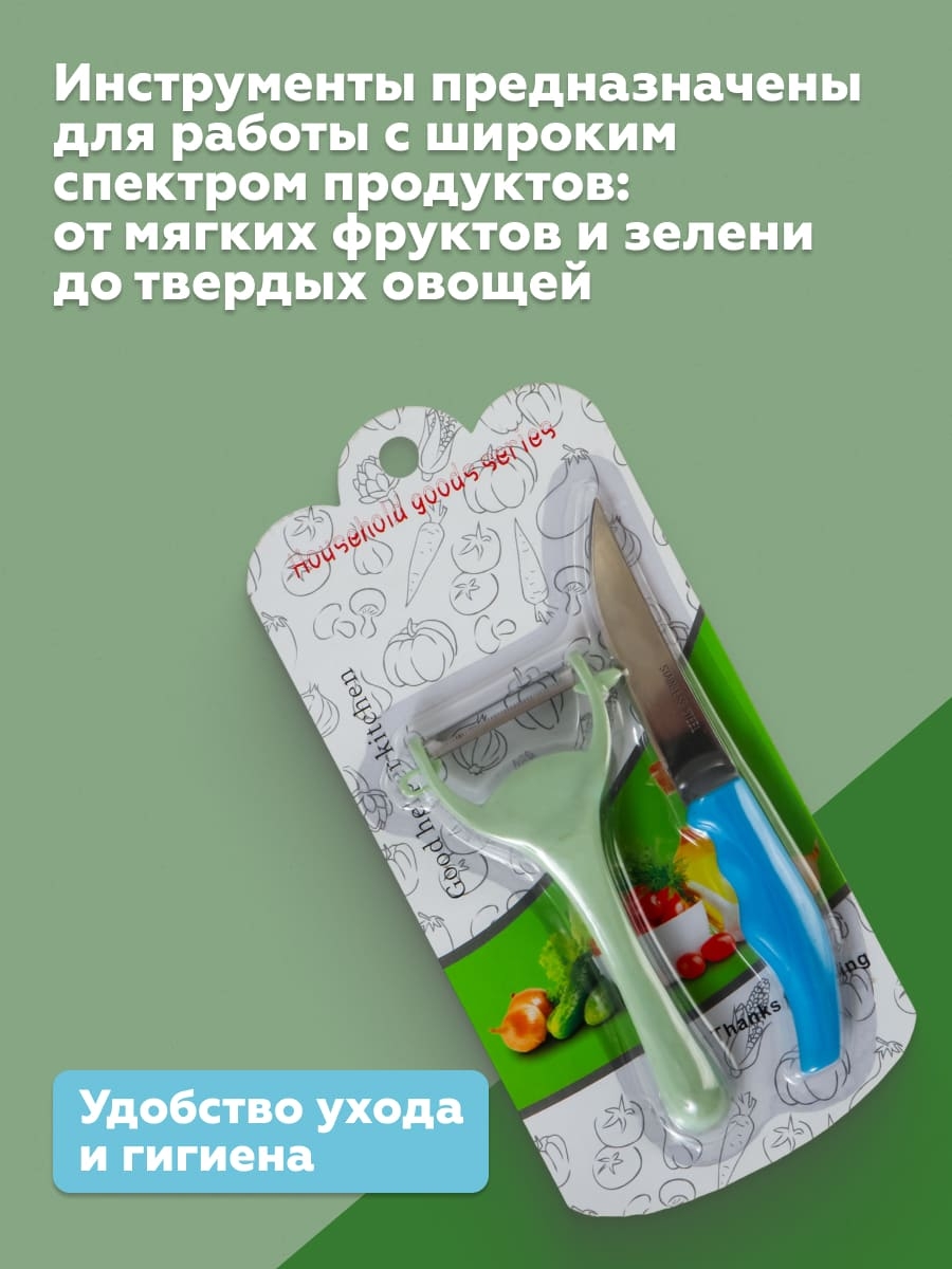 Данный набор из ножа для фруктов и овощей и овощечистки может использоваться для: чистки и нарезки овощей и фруктов, масла, зелени и лука.
