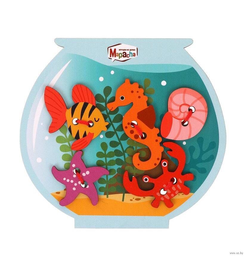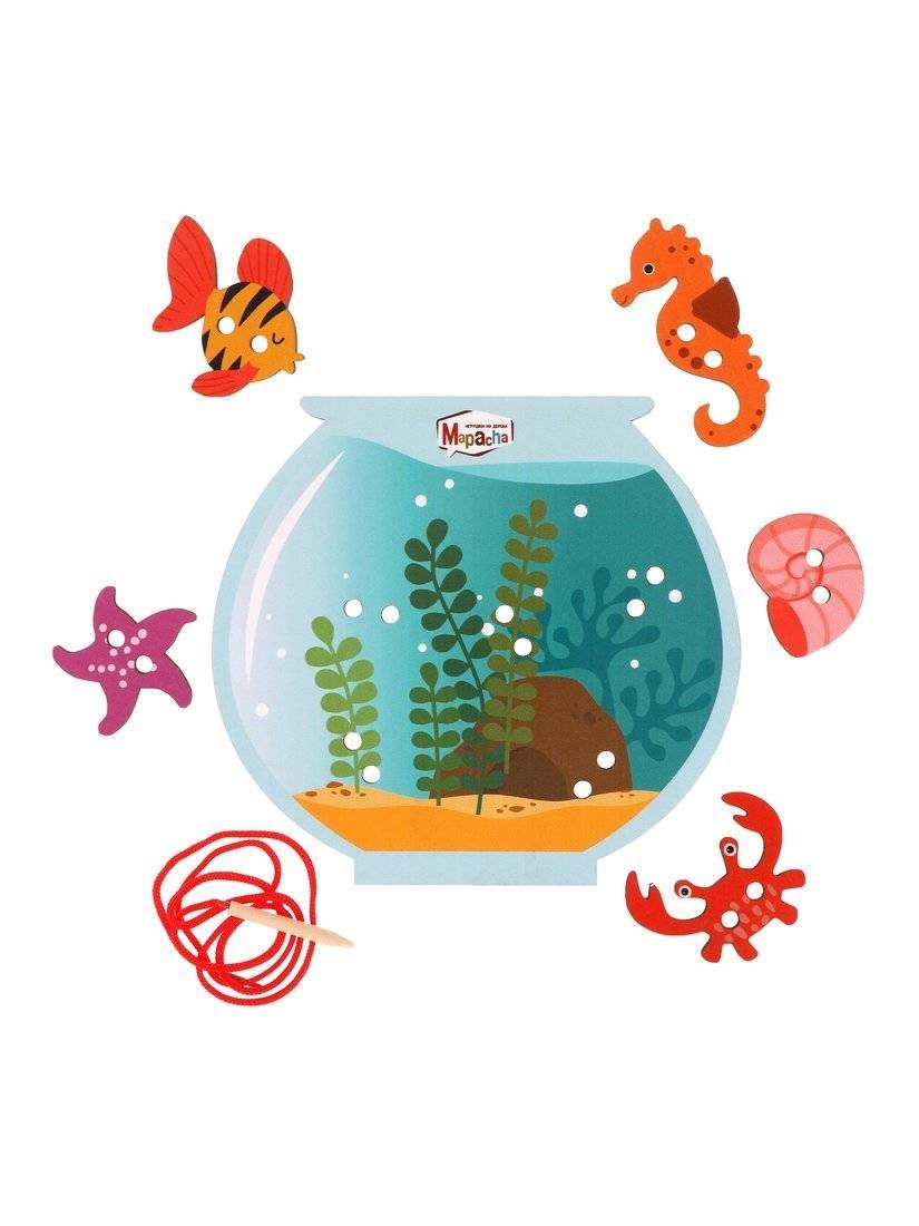 Шнуровка "Аквариум" станет замечательным подарком для вашего малыша. Задача игры – прикрепить различные детали к основной фигуре, прошнуровав их и закрепив узелками – рыбку, морскую звезду, морского конька, крабика и ракушку. Шнурок с деревянным наконечником поможет крохе справиться с этой интересной задачей.