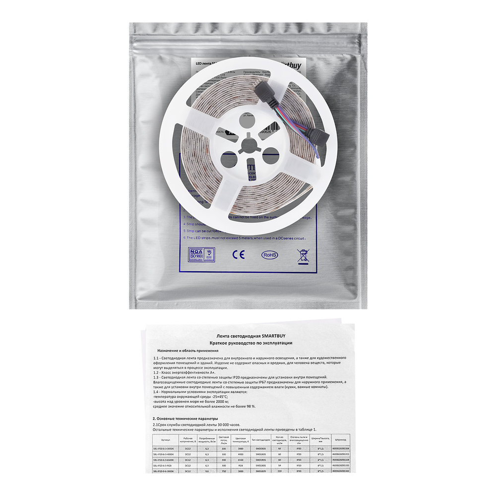 Двухслойная светодиодная LED лента SmartBuy сконструирована на базе светодиодов Epistar в корпусе 5050. Лента выпускается на гибкой печатной плате белого цвета шириной 8 мм и поставляется в катушках по 5 м. Каждая катушка с лентой SmartBuy укомплектована проводами для подключения к источнику питания. Срок службы светодиодной ленты Smartbuy составляет 30 000 часов. Гарантийный срок эксплуатации – 12 месяцев.