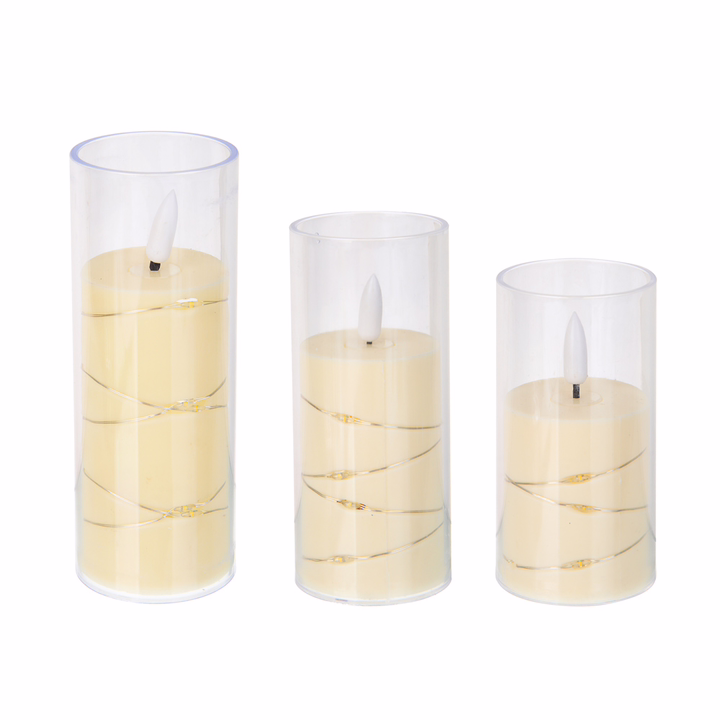 В комплекте три светильника разной высоты 10,5, 12,5 и 14,5 см с диаметром 5,5 см, изготовленные из качественных материалов.