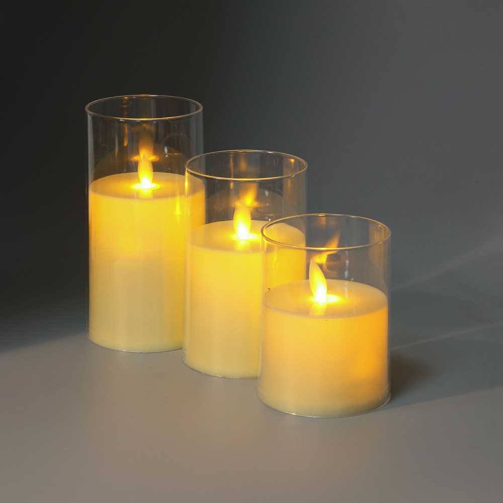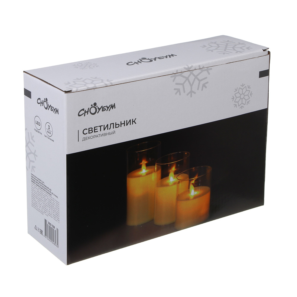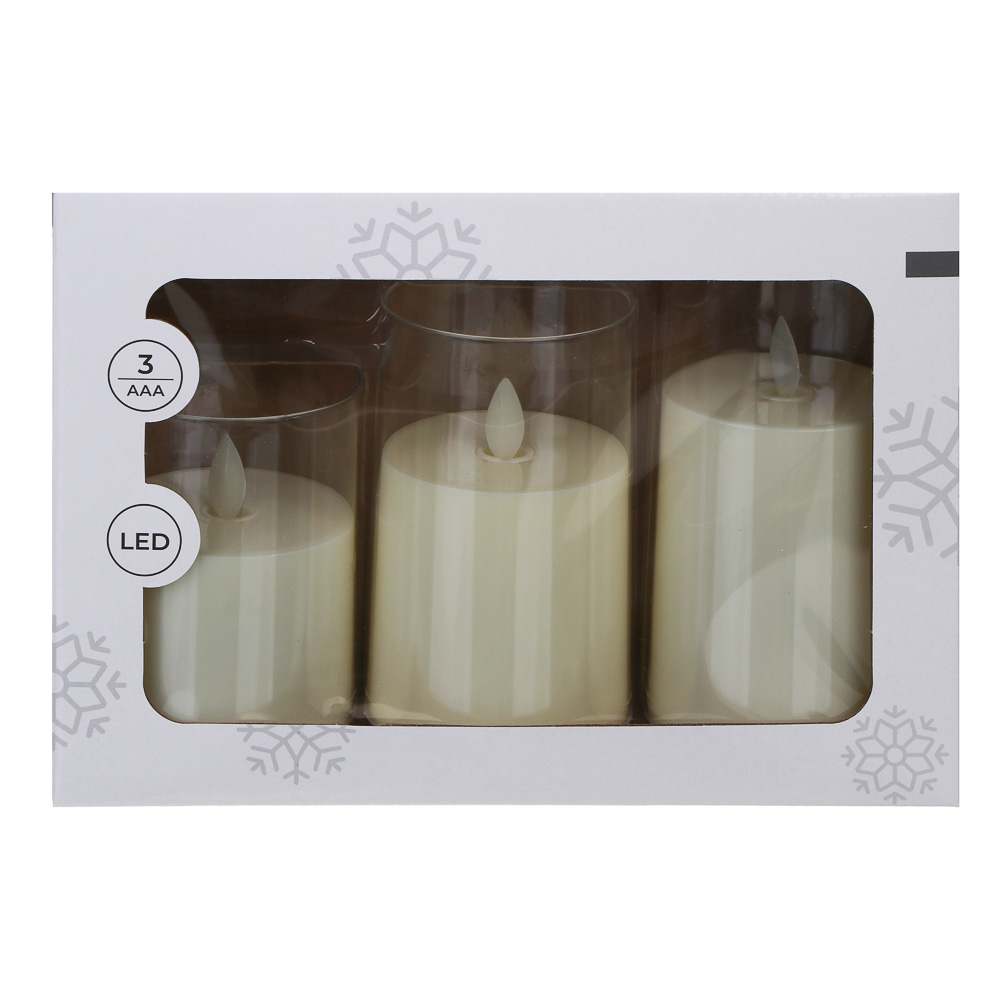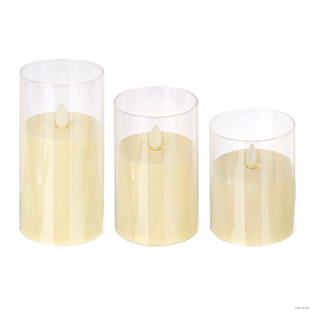 Каждая свеча выполнена в классическом дизайне: светло-бежевый корпус, прозрачный стакан и реалистичное мерцающее пламя, имитирующее настоящий огонь. Набор включает три свечи разных размеров: 7,8х10 см, 7,8х12,5 см, 7,8х15 см, что позволяет создать гармоничную композицию на столе, полке или камине.