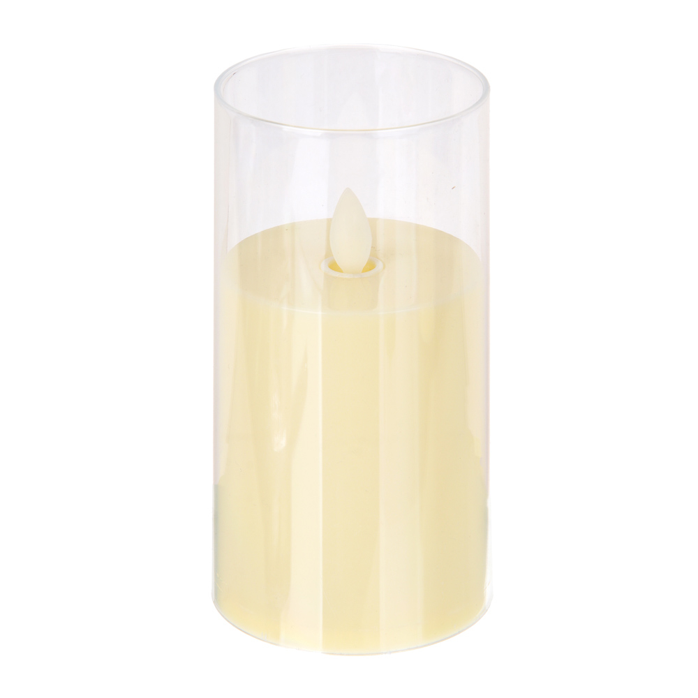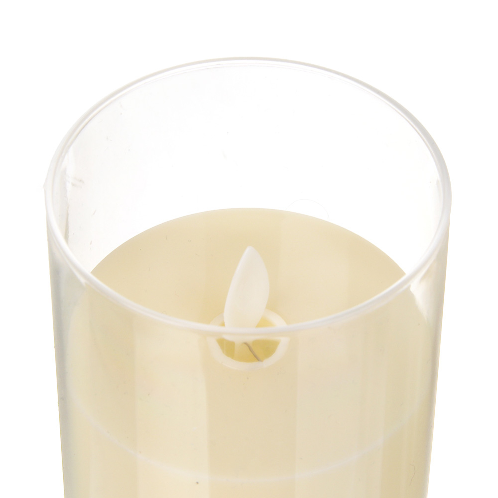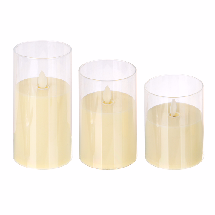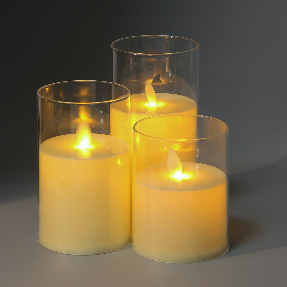 Каждая свеча выполнена в классическом дизайне: светло-бежевый корпус, прозрачный стакан и реалистичное мерцающее пламя, имитирующее настоящий огонь. Набор включает три свечи разных размеров: 7,8х10 см, 7,8х12,5 см, 7,8х15 см, что позволяет создать гармоничную композицию на столе, полке или камине.