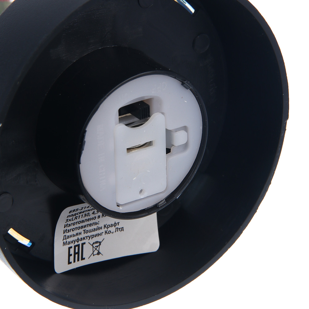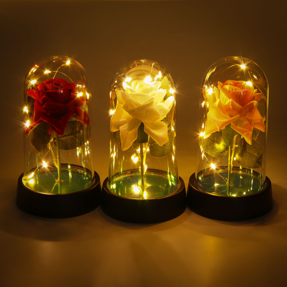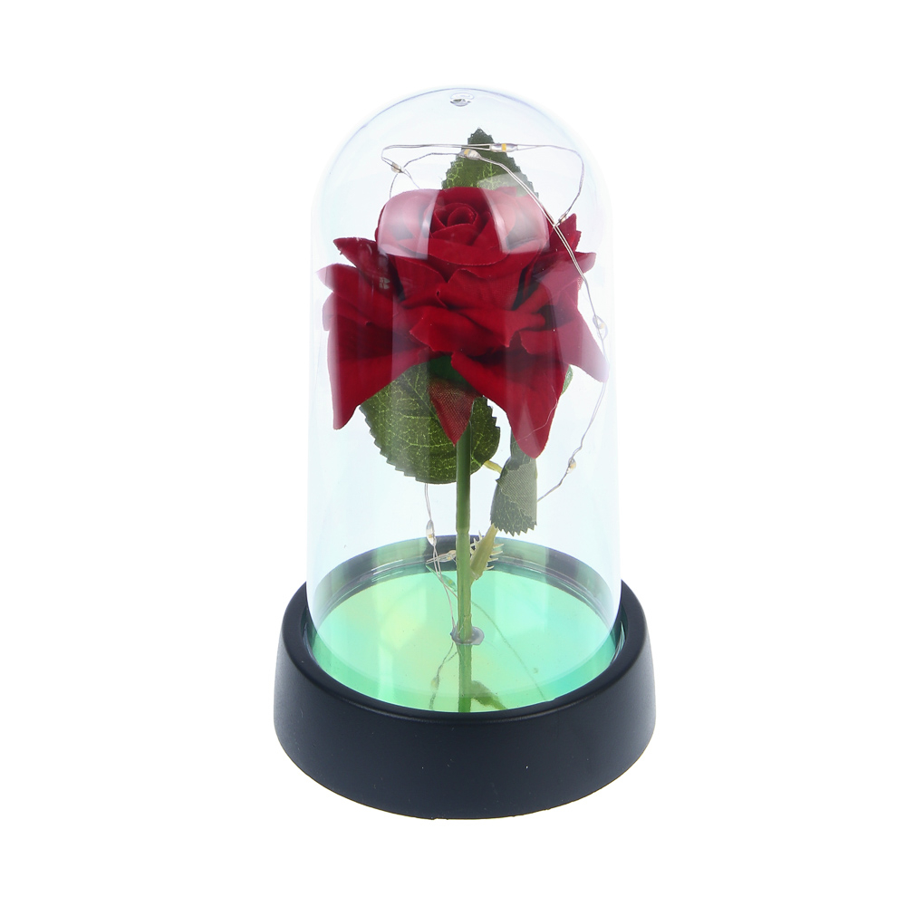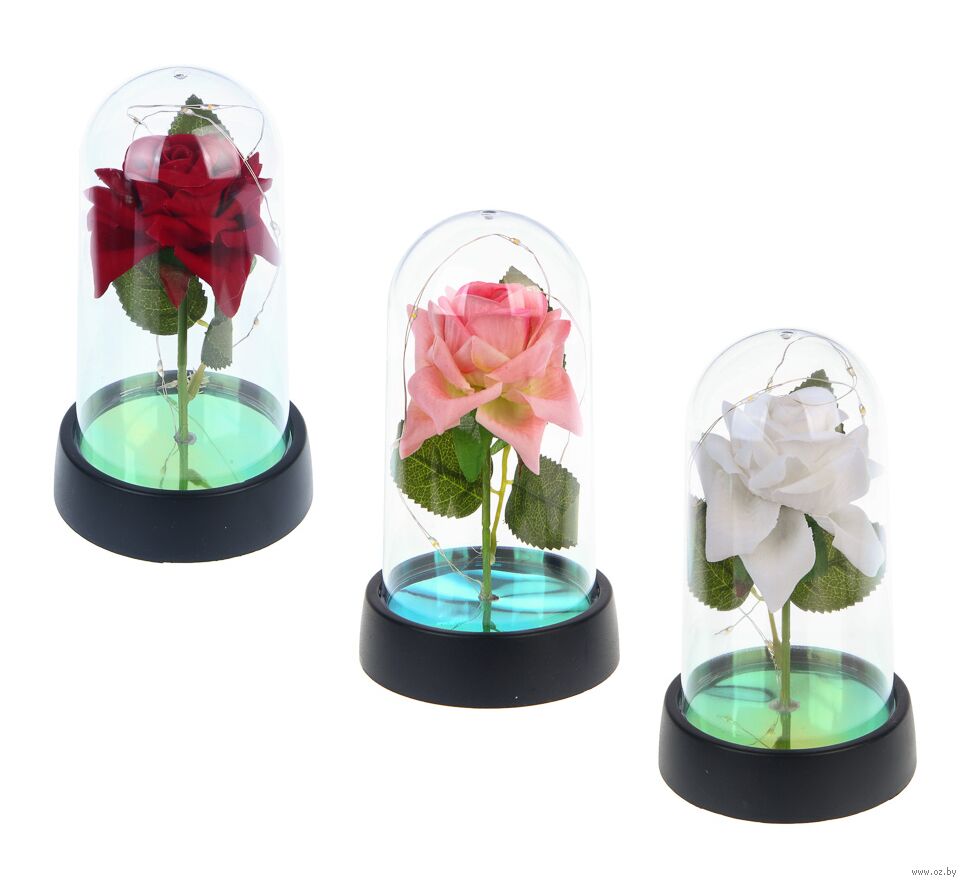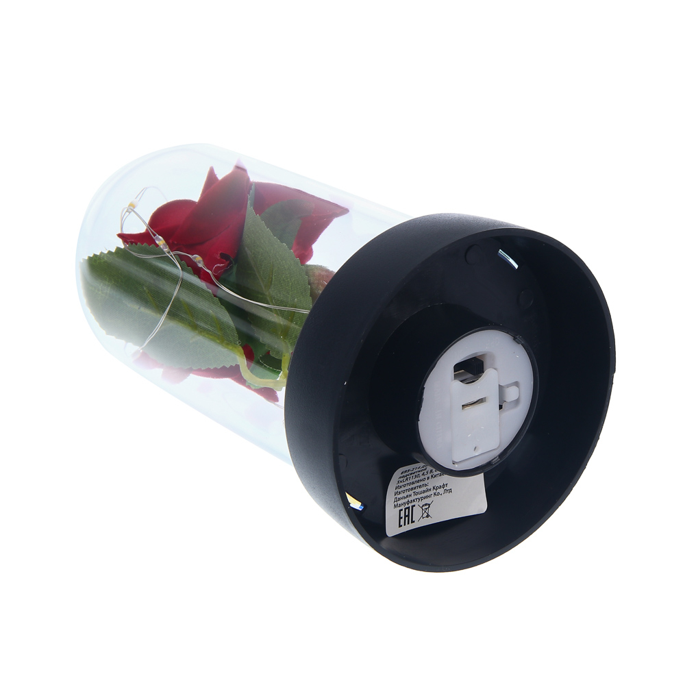 Колба оснащена LED-подсветкой, которая мягко освещает цветок, создавая уютную и романтичную атмосферу. Светильник работает от трёх батареек LR1130, что делает его мобильным и удобным для размещения в любом месте интерьера.