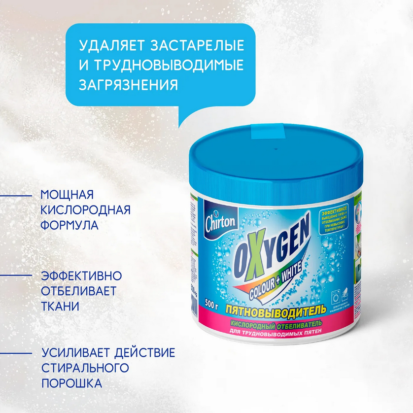 Благодаря специальному составу, Chirton Oxygen эффективно проникает между волокнами ткани и устраняет трудновыводимые пятна, не нарушая структуру ткани.